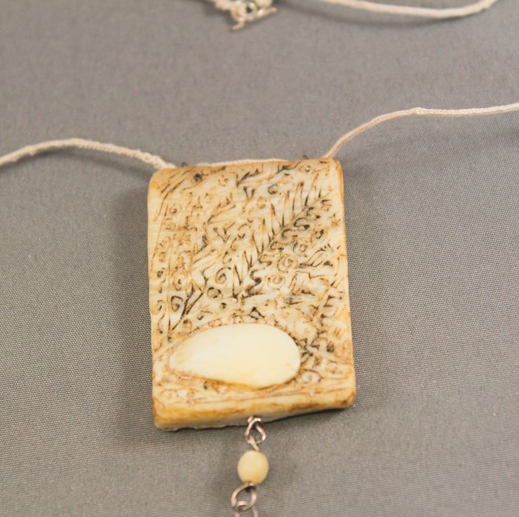 A small rectangular tablet shape made to imitate ivory or bone in polymer clay. The pendant has incised patterns across it's surface in curving lines and has a fragment of natural shell embedded at the lower edge. After firing I painted brown acrylic paint over the surface and then wiped back to leave it only in the incised lines.