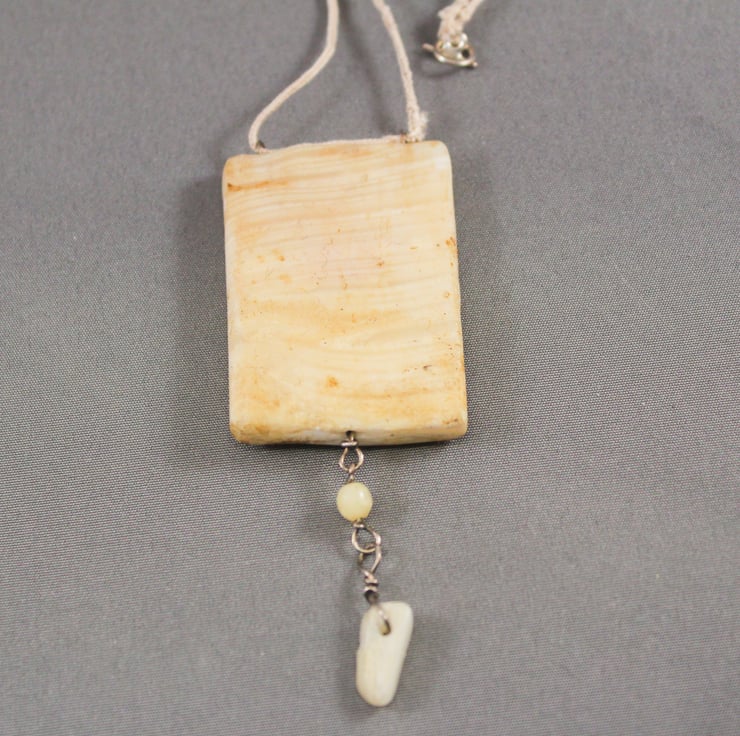 Suspended from the lower edge, by loops of silver wire, are a bone bead and a mother of pearl chip bead, both of which are recycled from old jewellery.