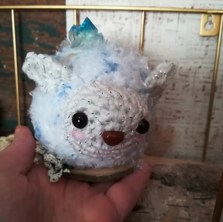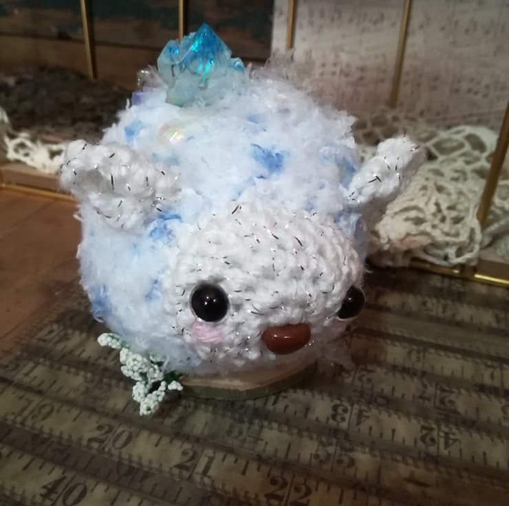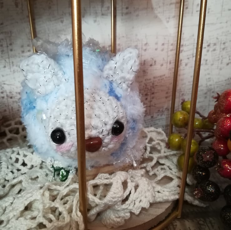 This little snow wisp is made using a lovely mottled fluffy yarn in blue and white. She sits on a little wooden base decorated with snow and white flowers.