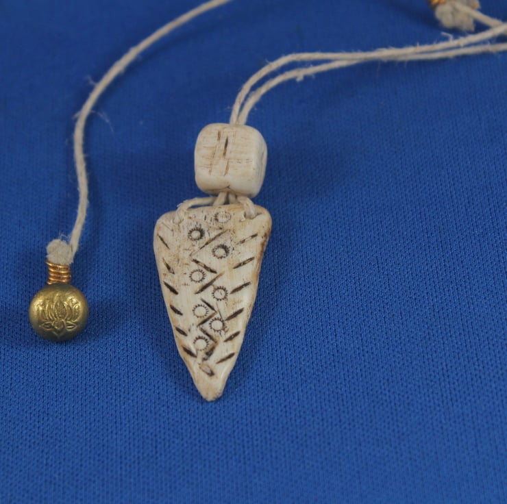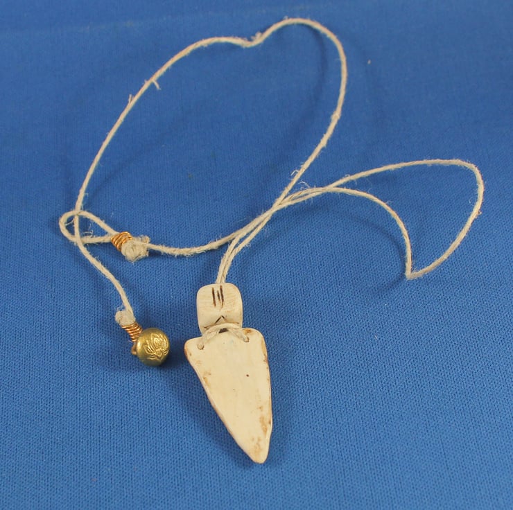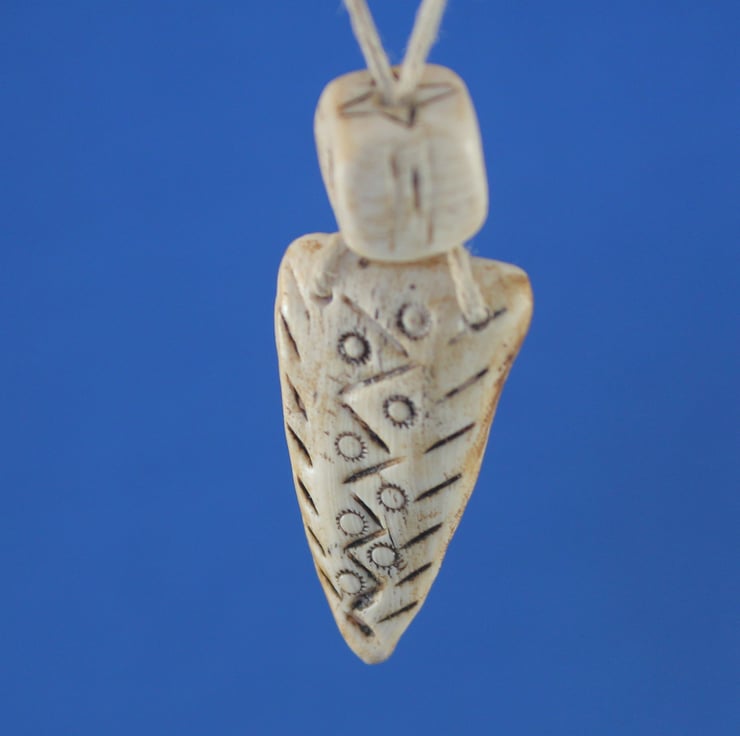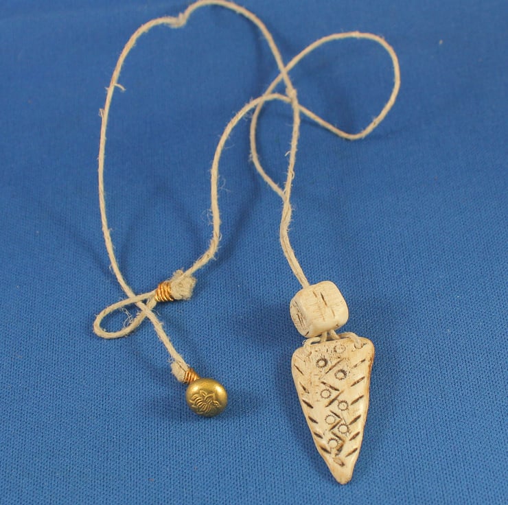 This little arrowhead pendant is made using layers of polymer clay to simulate bone or ivory. The arrow head has incised patterns on it which were stained by painting brown acrylic paint onto the surface and then wiping back, to leave just the incisions coloured.