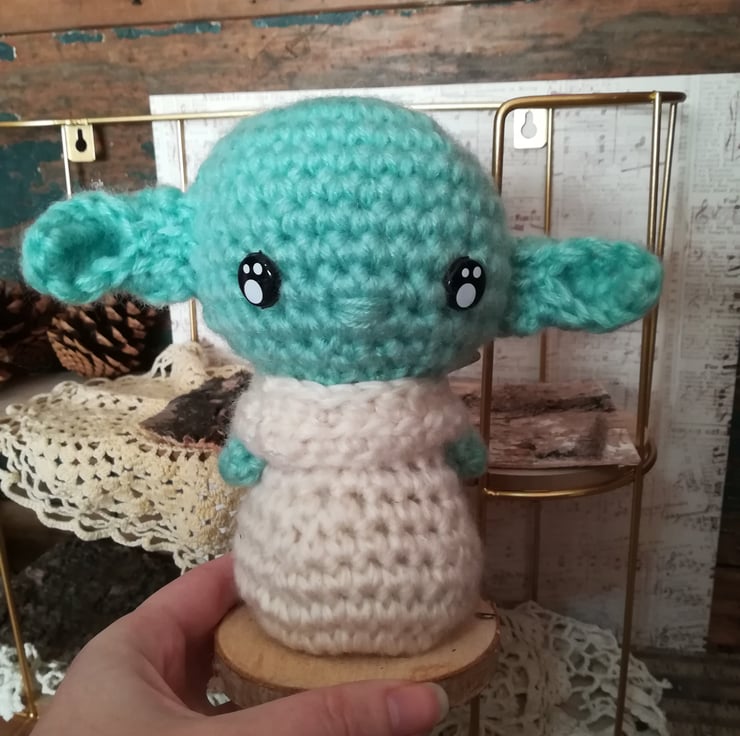 This baby Yoda is made from a lovely pale green yarn. He's sitting on a little wooden base and measures about 7 x 7 inches.