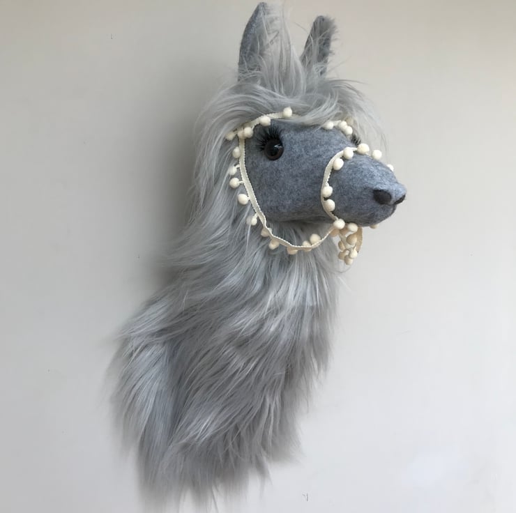 Predominantly made using a paper mache technique to create the animals anatomy of the head which is then mounted on a solid wooden hessian covered plaque with hook ready to hang. Various fabrics are used to bring the animal to life and finally finished with eyes and eyelashes.