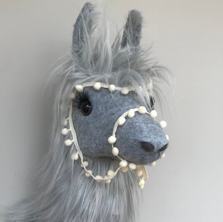 Handmade grey Llama, Llama or Alpaca with cream pom pom trim.