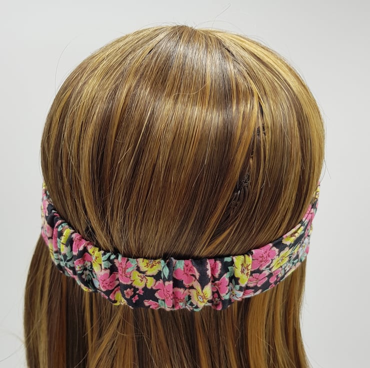 Wide headband with an elasticated back. This headband made from soft lightweight stretchy viscose jersey, it is approximately 19 cm ( 7.5" ) wide.