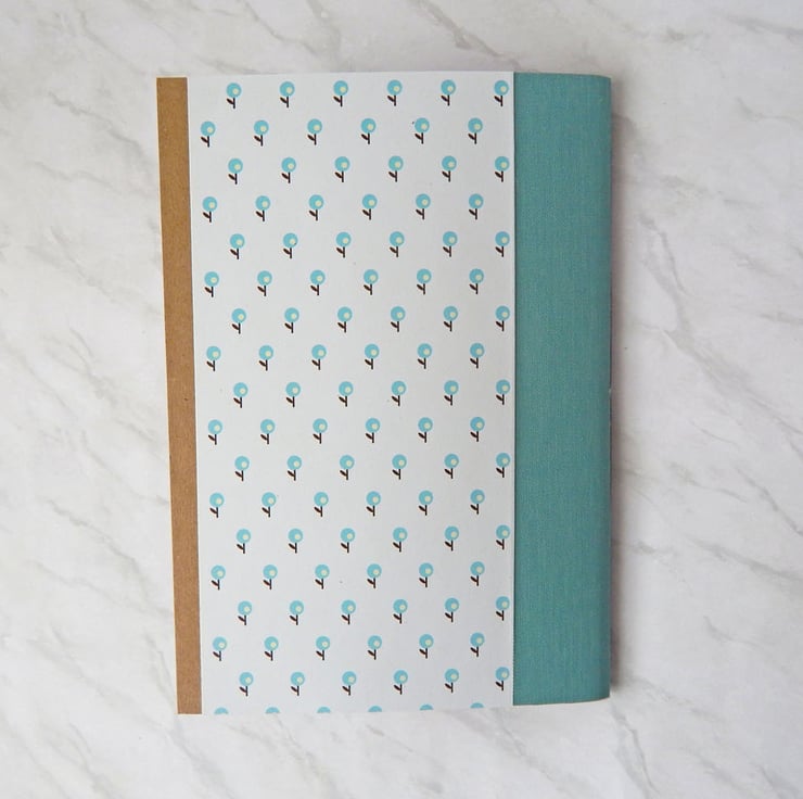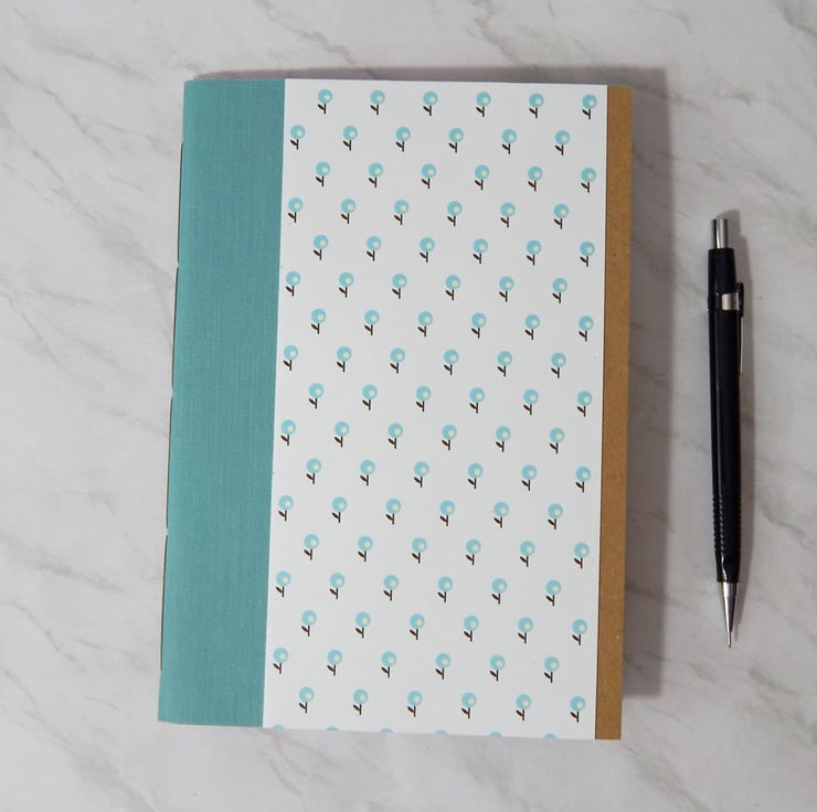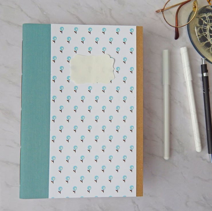 - The spine edge of the notebook is trimmed with aqua blue bookcloth, which gives the appearance of a traditional style book.