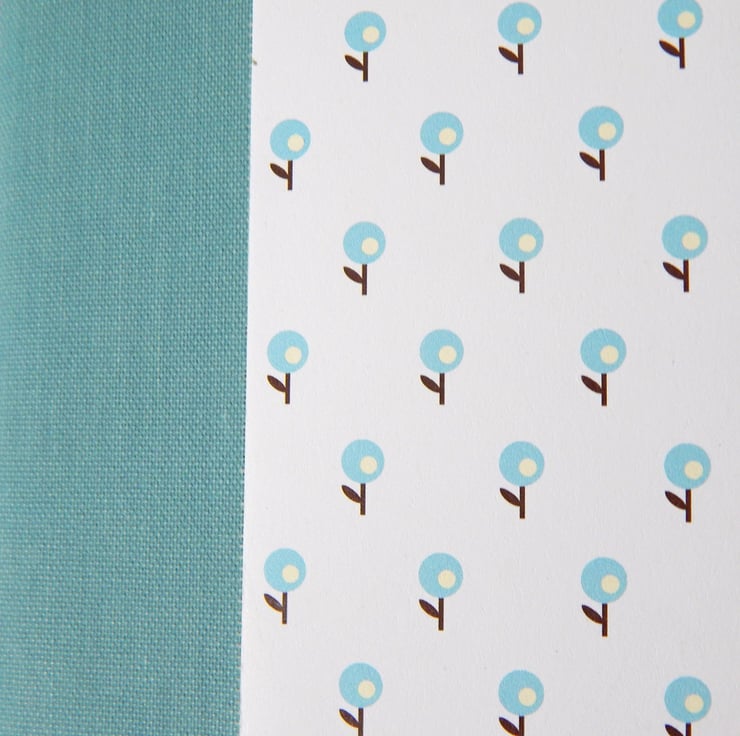- Paper panels on the front and back covers, with patterned paper in a floral design of aqua blue, pale yellow and dark brown on a white background.