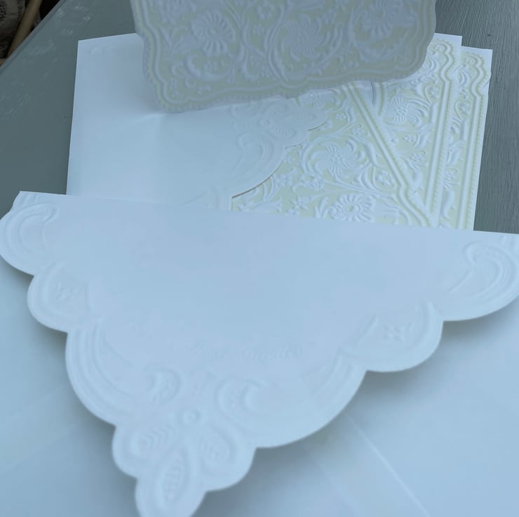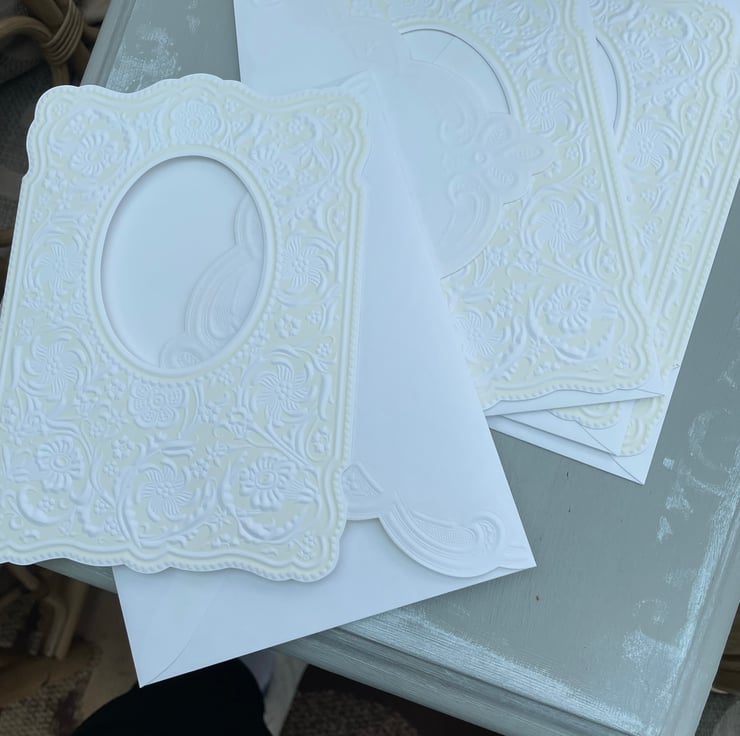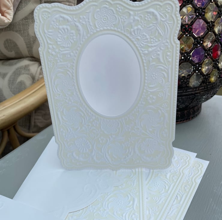 A matching set of 4 cards and envelopes in a fancy label shape. These 18x13cm card blanks are bifold and have an oval apature measuring 7.5x5.5cm. The front has an ornate outline and has an elaborate embossed detail. The colour is a very pale yellow and the embossing is in white.The envelope has a pretty embossed feature to the back. A very pretty design.