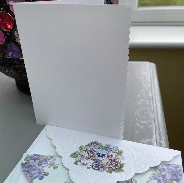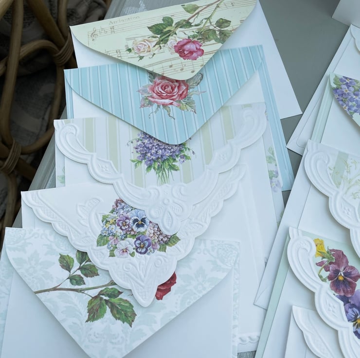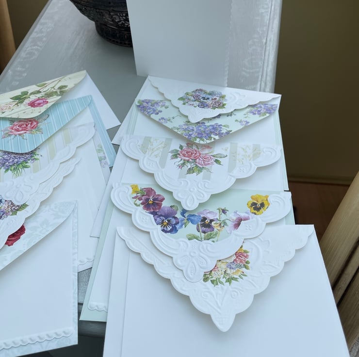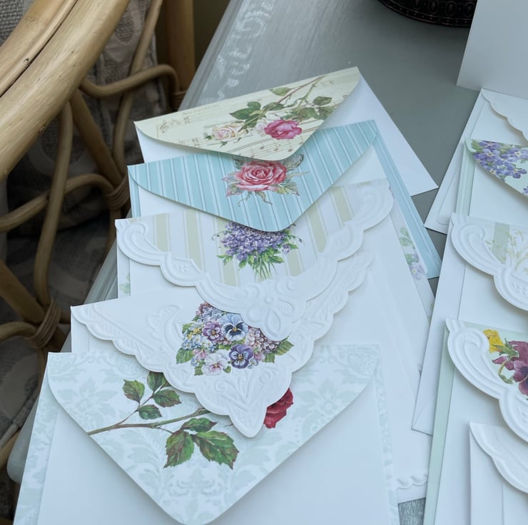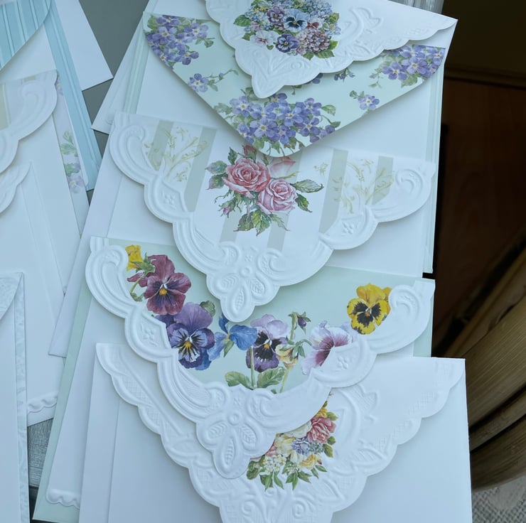 The main feature with this set is the envelopes. Each card measures 13x10cm approximately. The are pure white with a scalloped embossed border down the longer side. the star of the show here are the envelopes. Each envelope has a different design, some are pure white, some hace a delicare blue or green colouring with a subtle stripe or pattern. Each one has a beautiful design on the flap, this ranges from an all over floral design to a floral spray or border, some are embossed, some carry the design onto the front of the envelope. A true mix of floral and feminine designs.