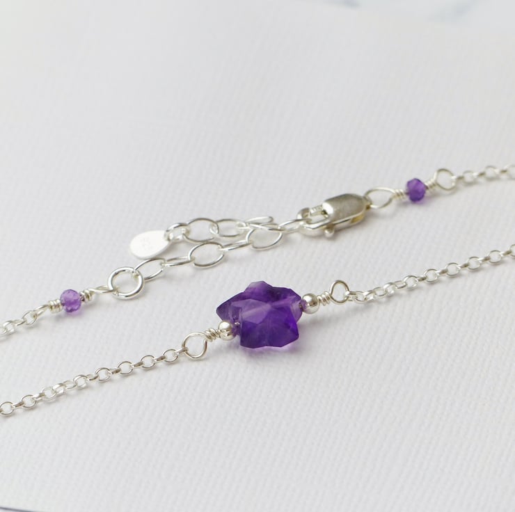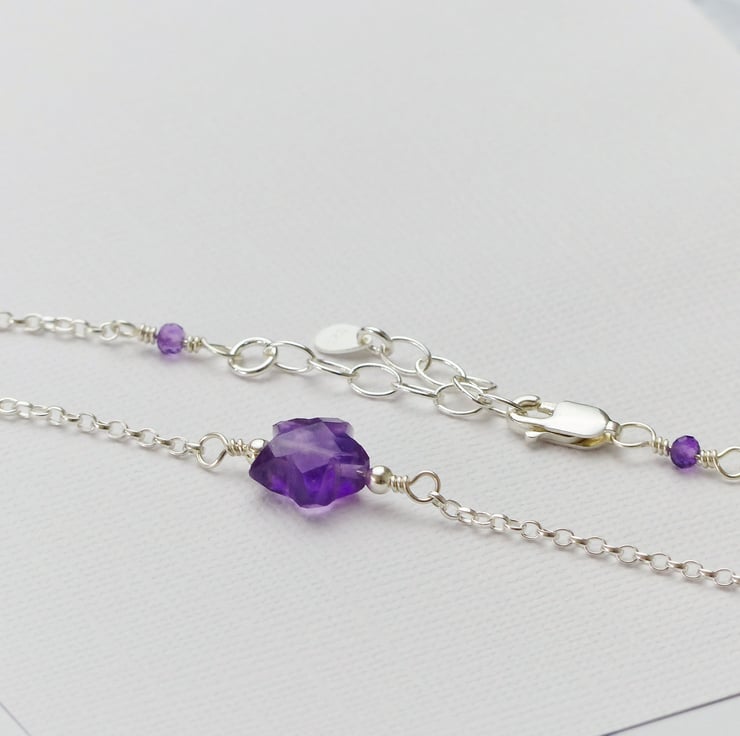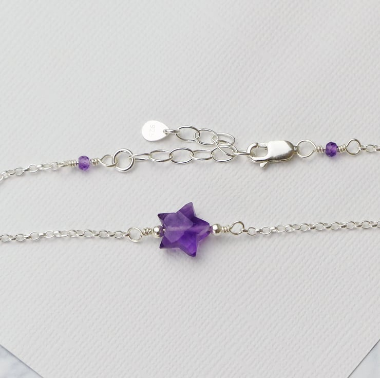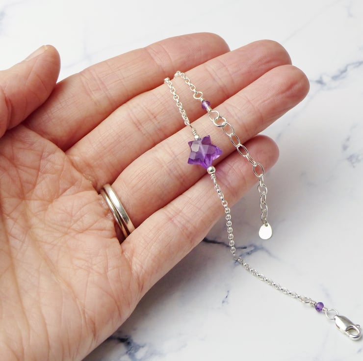 This gorgeous sterling silver bracelet features a stunning genuine amethyst star. Two natural amethyst gemstone beads are also wire wrapped to the lobster clasp and extension chain to give the bracelet an elegant finish. Each faceted gemstone is carefully wrapped by hand with sterling silver wire onto an adjustable chain making an ideal gift.