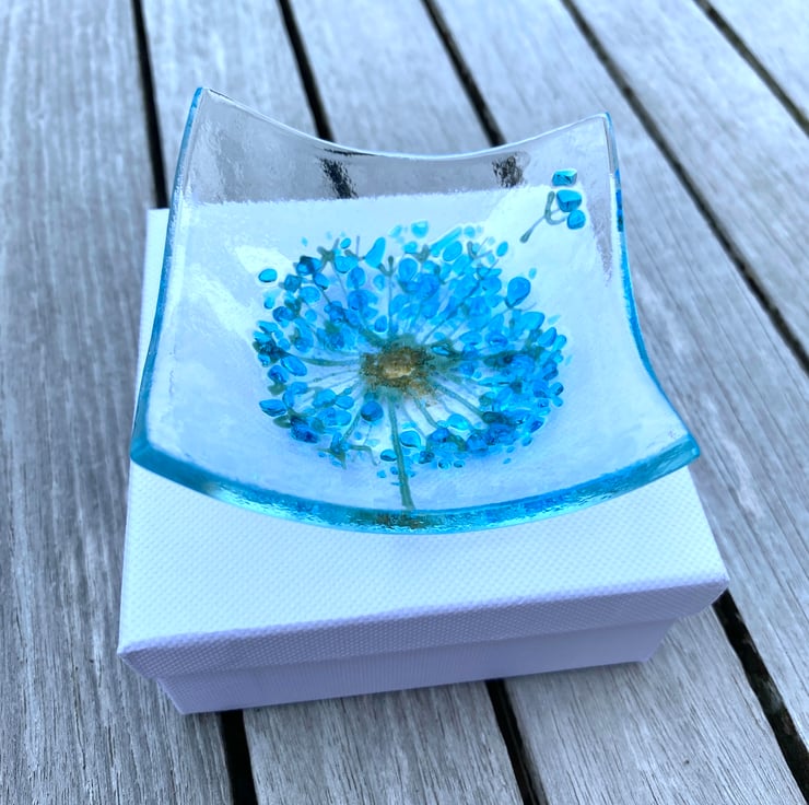 So pretty and very popular , these pretty blue dandelions are just lovely ( white also available see other listing) . Approximately 3.5 inch square this delicately pretty fused glass dishes are perfect to have by the bed or in the bathroom for small items of jewellry or pills . They are also great at ornaments . They come presented in a gloss white gift box so perfect for birthdays, Mother’s Day or Christmas . An affordable unique quality crafted gift .
