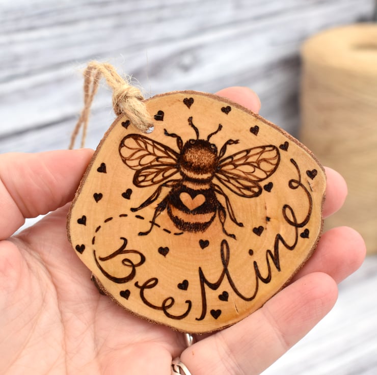 A beautiful bee love token or decoration, hand burned using pyrography / wood burning.