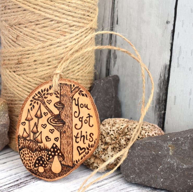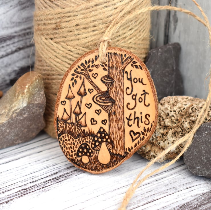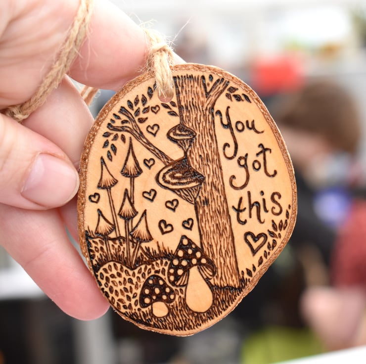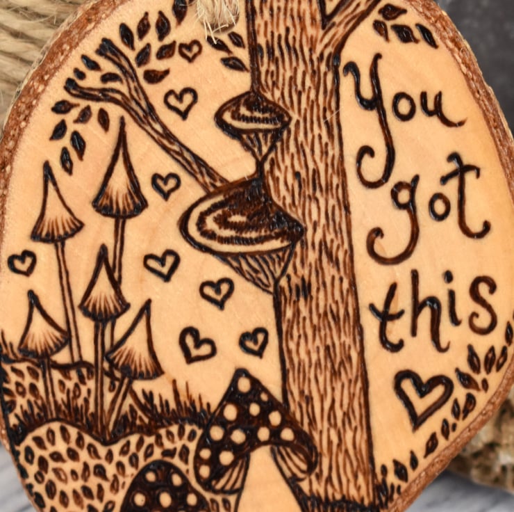 A fungi inspired positive affirmation token or decoration, hand burned using pyrography / wood burning.