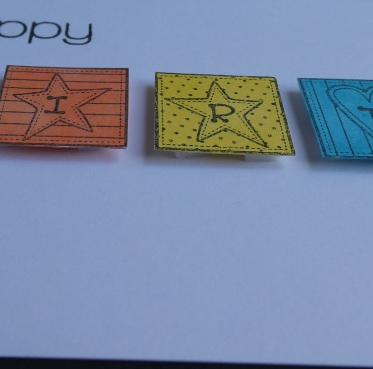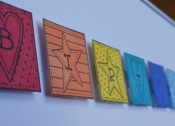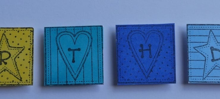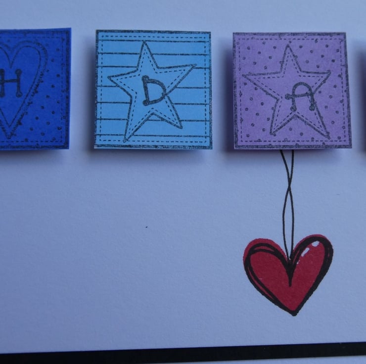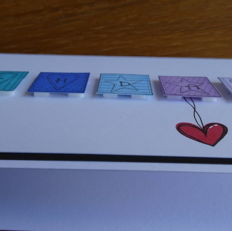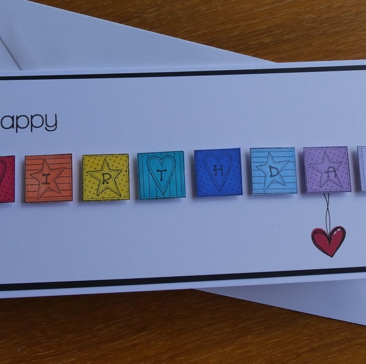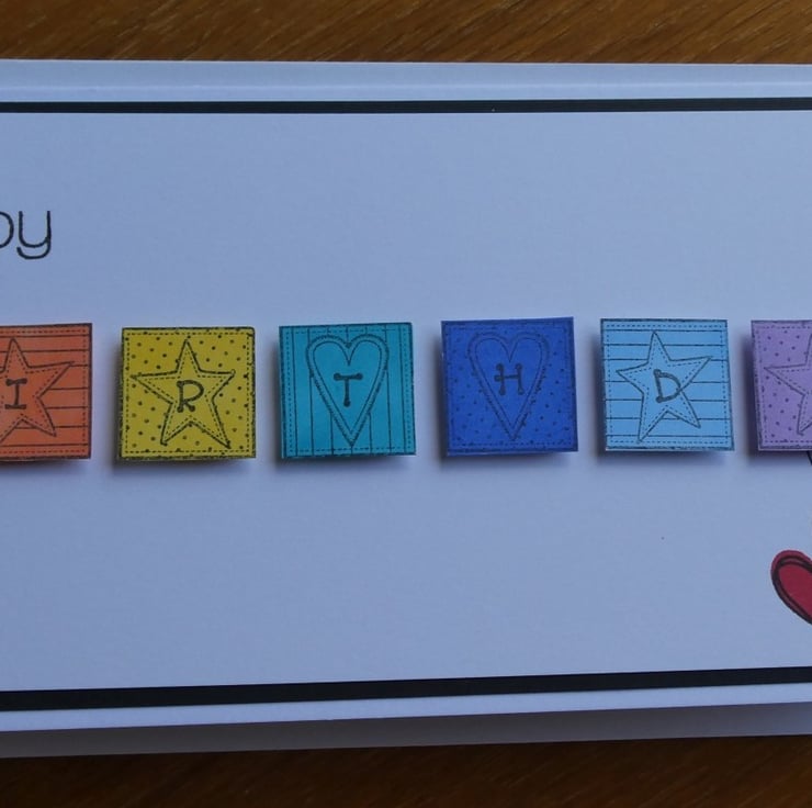 This Birthday card has a row of brightly coloured blocks stamped with individual letters spelling out the word Birthday.