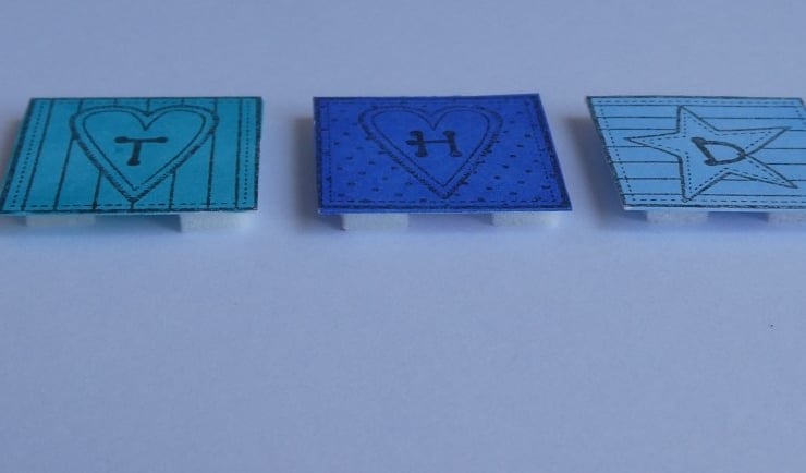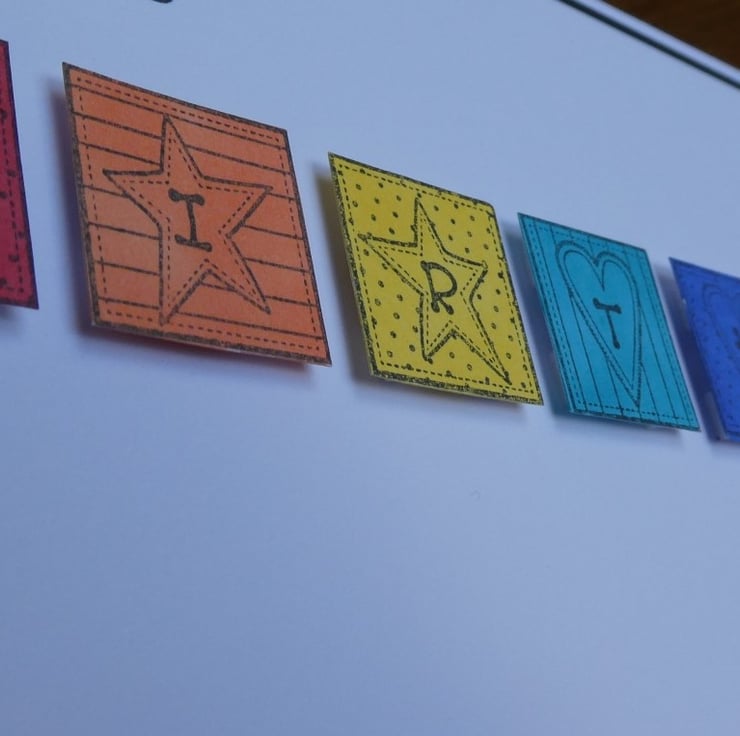 The blocks have a variety of hearts and stars with dotty and striped backgrounds and have all been hand stamped, coloured and cut.