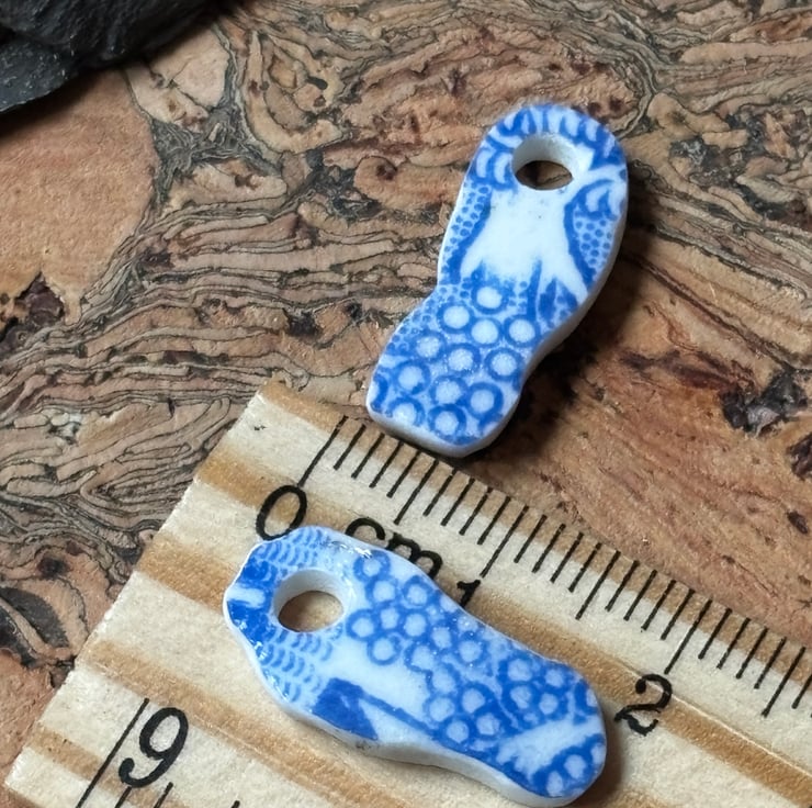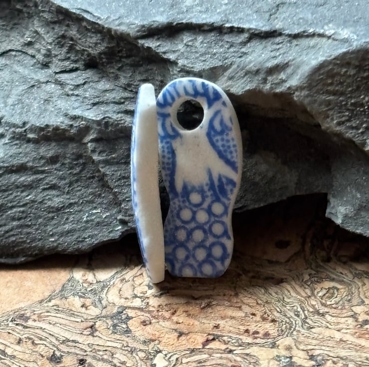I found a very damaged side of a small pot, blue and white pattern. The shard was stained and very cracked. It looked so fragile that I didn’t think it would be able to be used. However, after cleaning and fully drying out I was able to clip the piece which broke into these two distinctive shapes. I gently sanded the sharp edges, only a little bit of glaze remains on the front and back glaze has worn away. Sealed with Eco Friendly Matte Sealant.
