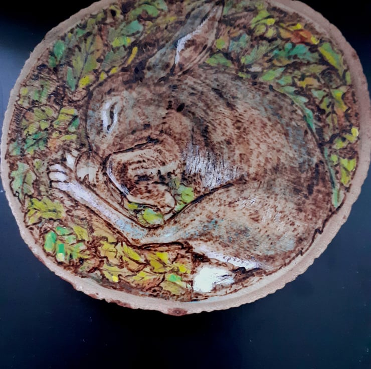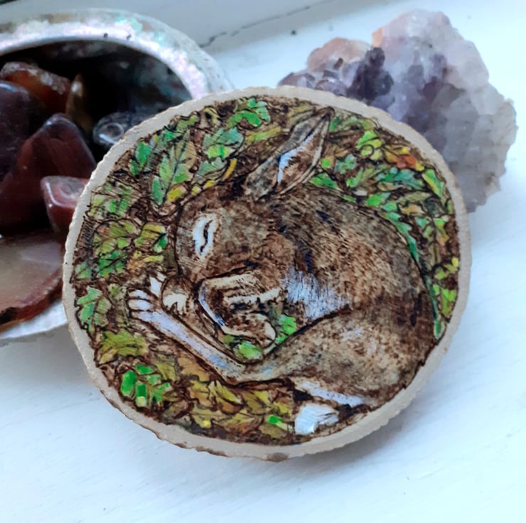 Woodburned sleeping hare in his bed of leaves. 10cm.approx willow slice coloured and sealed.