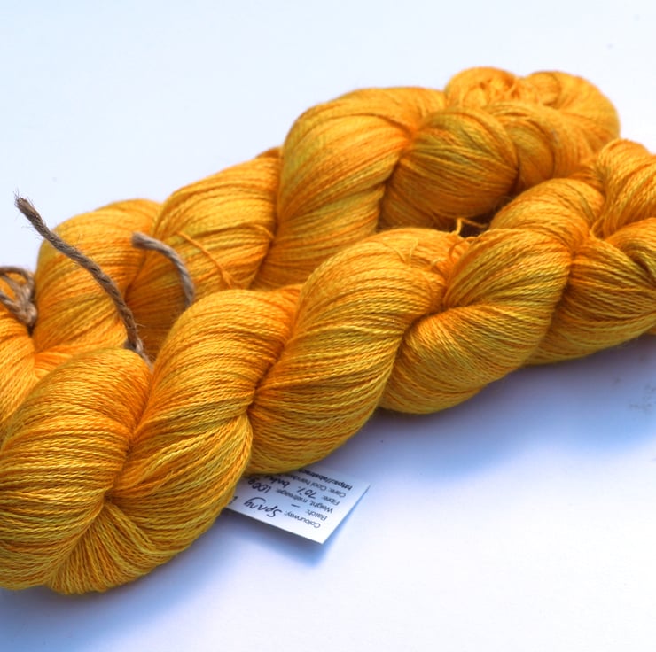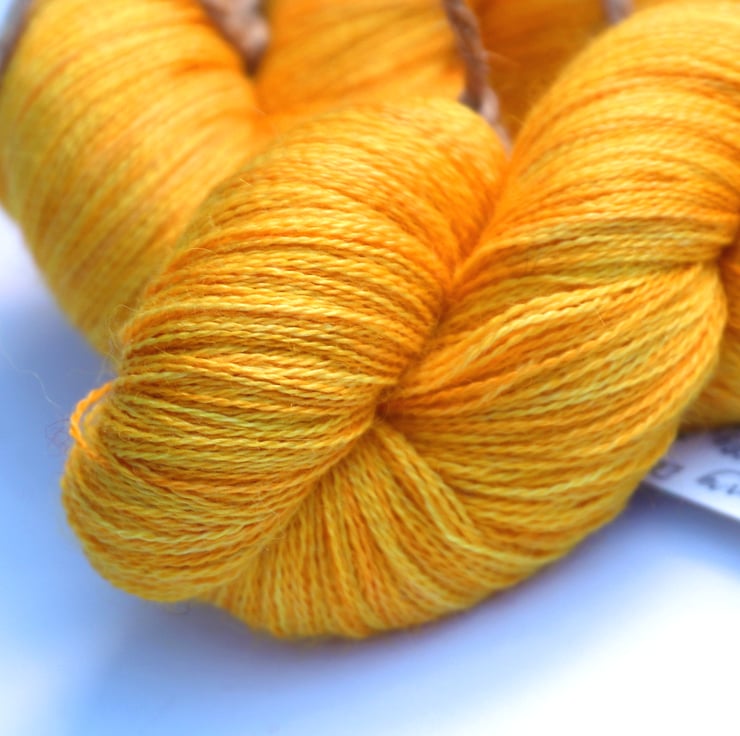 Bright, cheerful semi-solid sunshine (or daffodil) yellow (more saturated than the photos suggest). This gorgeous and luxurious yarn has the softness and warmth of alpaca with the smooth sheen and cool feel of silk. It should make beautiful lace projects. There is one skein left. Photographs have been taken and edited in bright but wintery natural light.