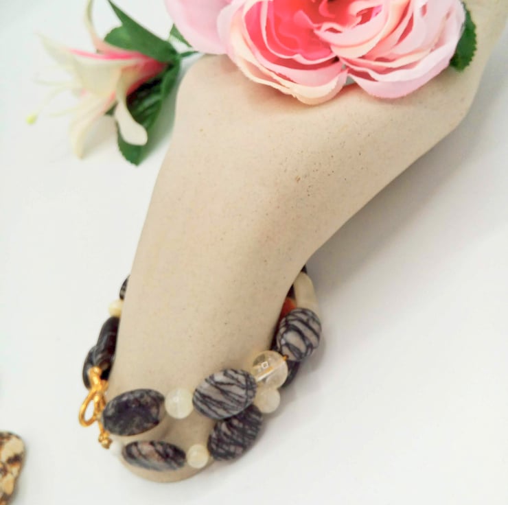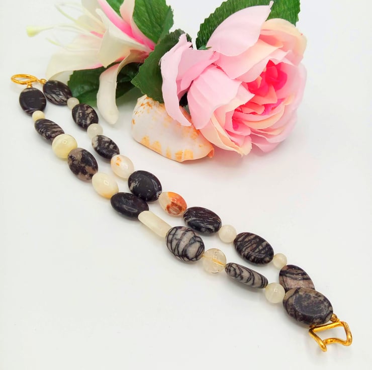 This striking 2 strand bracelet with gold plated clasp would look great for everyday wear or a casual evening get together. It would make a lovely gift for any lady for a birthday or anniversary, or be a lovely treat for yourself. The bracelet is made in 2 strands with a mixture of shapes and sizes of jade, quartz and agate beads in shades of black and white. It will comfortably fit a wrist 7 - 8 inches (18 - 21 cm) in circumference. It is fastened with a gold plated clip clasp. The bracelet will be dispatched wrapped in tissue paper in an organza bag and delivered to you via Royal Mail first class post.