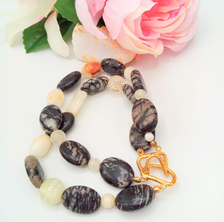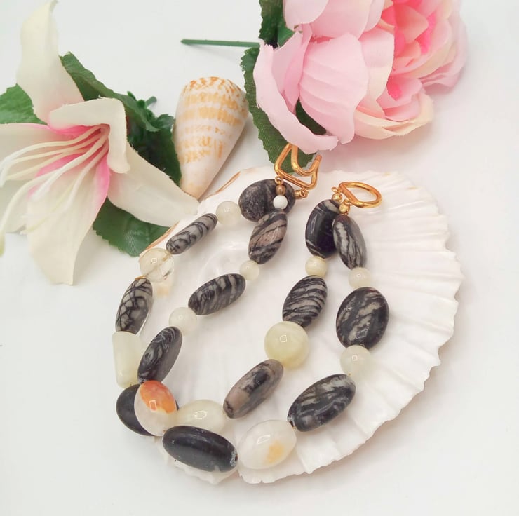 This striking 2 strand bracelet with gold plated clasp would look great for everyday wear or a casual evening get together. It would make a lovely gift for any lady for a birthday or anniversary, or be a lovely treat for yourself. The bracelet is made in 2 strands with a mixture of shapes and sizes of jade, quartz and agate beads in shades of black and white. It will comfortably fit a wrist 7 - 8 inches (18 - 21 cm) in circumference. It is fastened with a gold plated clip clasp. The bracelet will be dispatched wrapped in tissue paper in an organza bag and delivered to you via Royal Mail first class post.