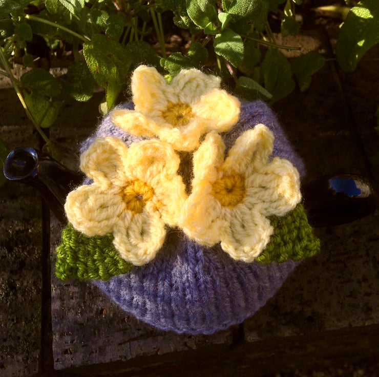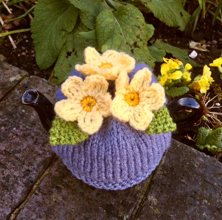 I have hand knitted this small grey tea cosy using a lovely wool mix yarn. Attached to the top I have added three primroses and leaves. The crochet flowers are yellow with darker gold centres and the knitted leaves are lime green. They are made using acrylic yarn.