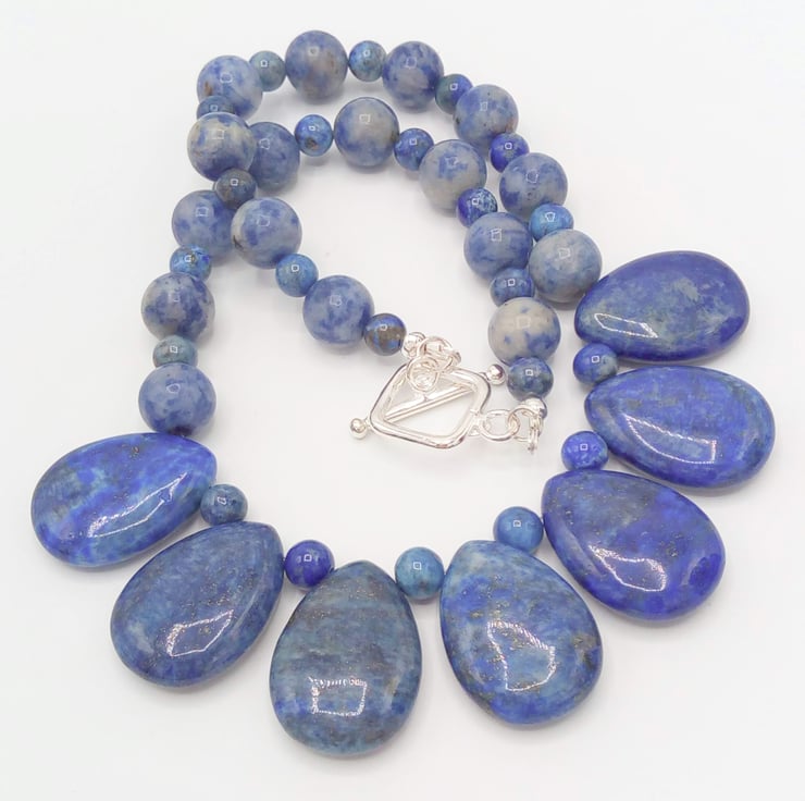 This beautiful jewellery set comprises a necklace and pair of earrings with gorgeous cobalt blue lapis lazuli beads. The necklace is made using beautiful Lapis Lazuli 20 mm x 18 mm teardrop, 6 mm and 10 mm round beads. The necklace is fastened with a pretty silver plated square toggle clasp. The earrings are made with a 10 mm and an 8 mm round beads and they are suspended on silver plated hook ear wires. The necklace is 16 inches (41 cm) in length and the earrings have a 1 inch (2.25 cm) drop from the base of the ear wire. The jewellery set will be dispatched wrapped in tissue paper in an organza bag and delivered to you via Royal Mail first class post. The set would look great for a special occasion. It would also make an ideal gift for your friends or relatives or a lovely treat for yourself.