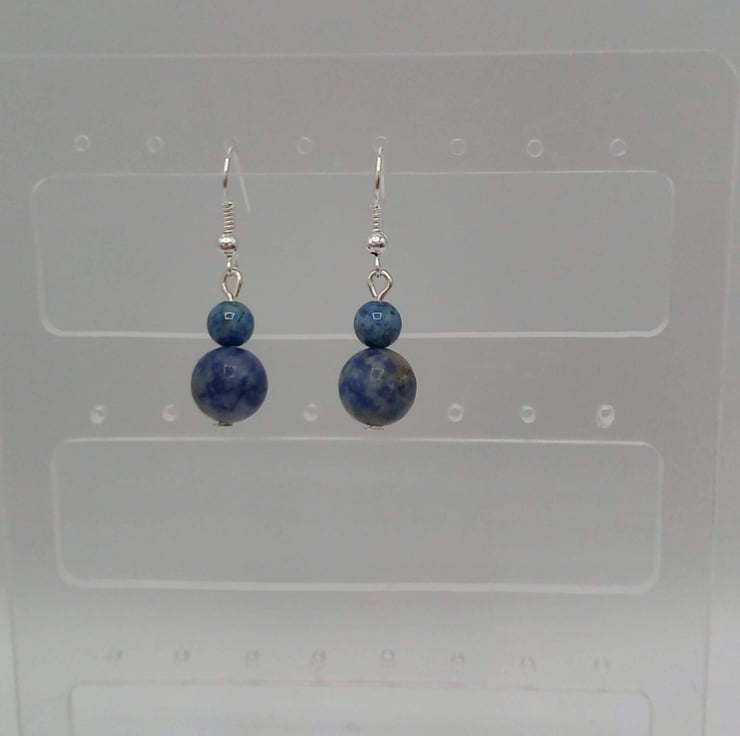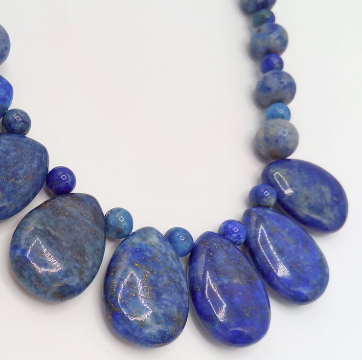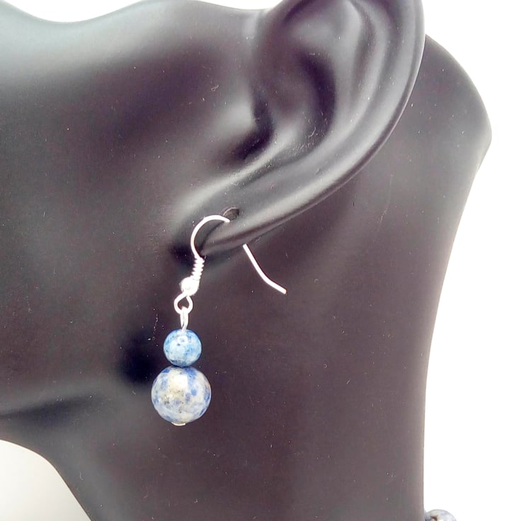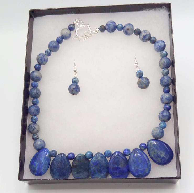 This beautiful jewellery set comprises a necklace and pair of earrings with gorgeous cobalt blue lapis lazuli beads. The necklace is made using beautiful Lapis Lazuli 20 mm x 18 mm teardrop, 6 mm and 10 mm round beads. The necklace is fastened with a pretty silver plated square toggle clasp. The earrings are made with a 10 mm and an 8 mm round beads and they are suspended on silver plated hook ear wires. The necklace is 16 inches (41 cm) in length and the earrings have a 1 inch (2.25 cm) drop from the base of the ear wire. The jewellery set will be dispatched wrapped in tissue paper in an organza bag and delivered to you via Royal Mail first class post. The set would look great for a special occasion. It would also make an ideal gift for your friends or relatives or a lovely treat for yourself.