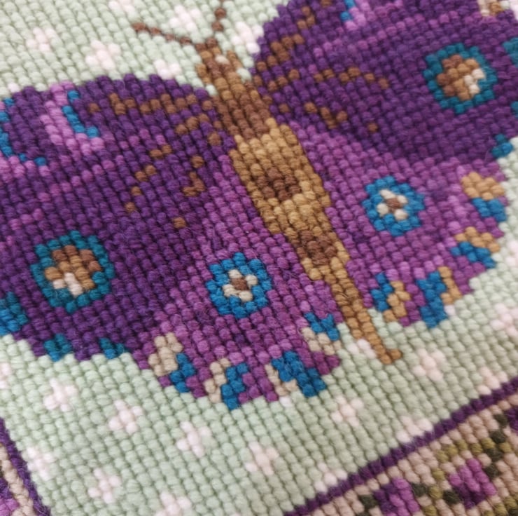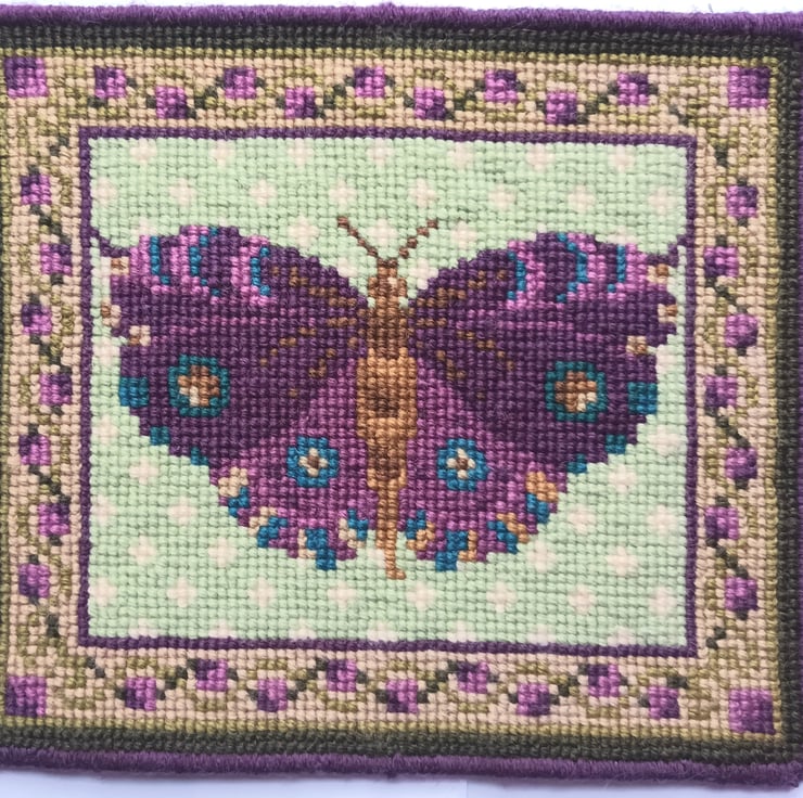 This charming design is one of a collection of five beautiful butterfly kits. The Purple Butterfly is framed by a delicate flower bud border and displays on a pale green and ivory background.