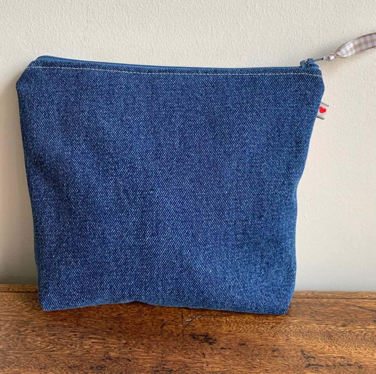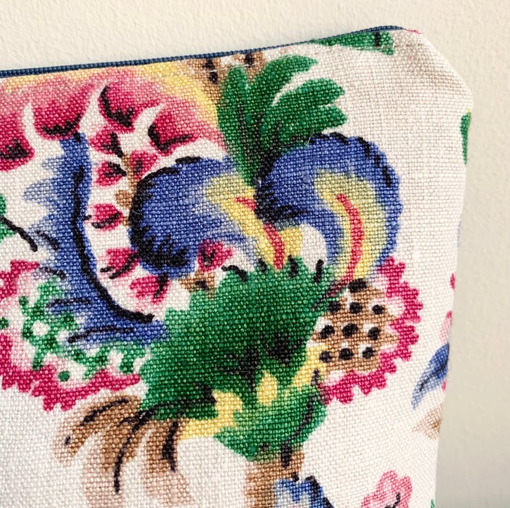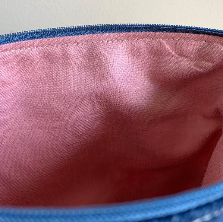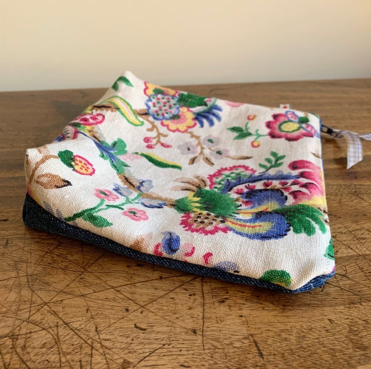 One of a kind soft zip pouch made from a small piece of bright vintage linen backed with reclaimed denim. It is lined with pale pink cotton.