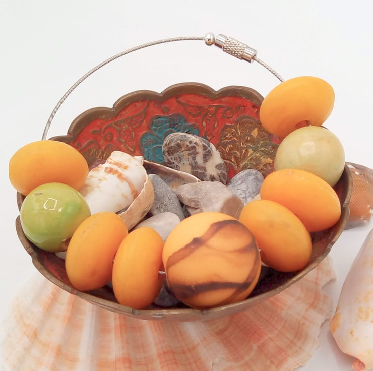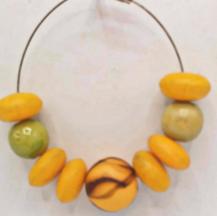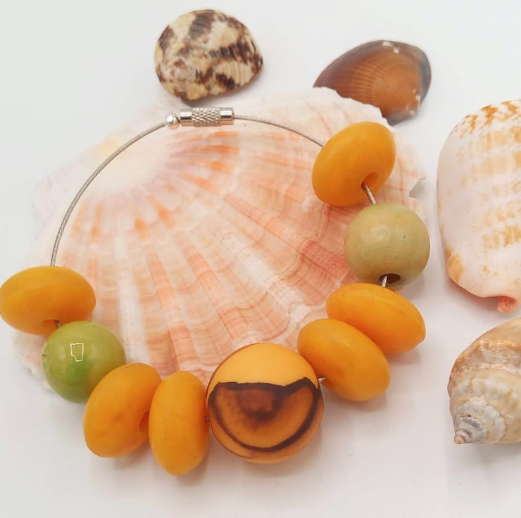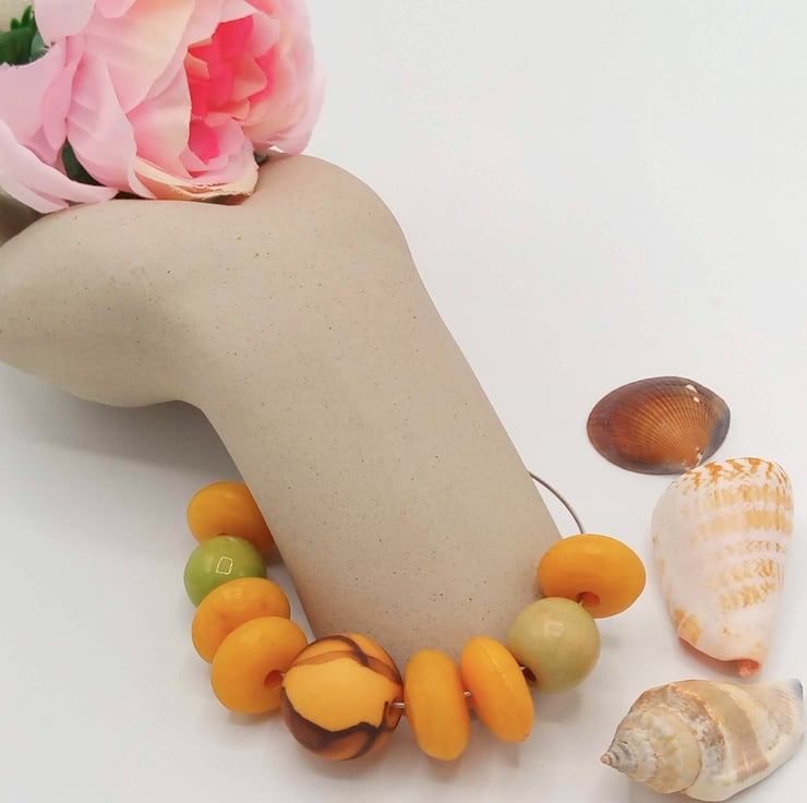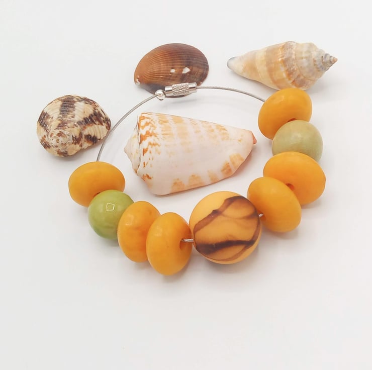 The bracelet is made using 20 mm x 10 mm yellow acrylic disc beads, 25 mm round green wooden beads a 15 mm red wooden bead, a 15 mm round green ceramic bead and a 35 mm round yellow and brown acrylic bead on a gray covered memory Wire Bracelet. It is 19.5 cm in circumference and has a silver plated screw clasp. It will fit any normal sized wrist and it could also be used as an anklet.