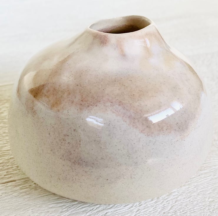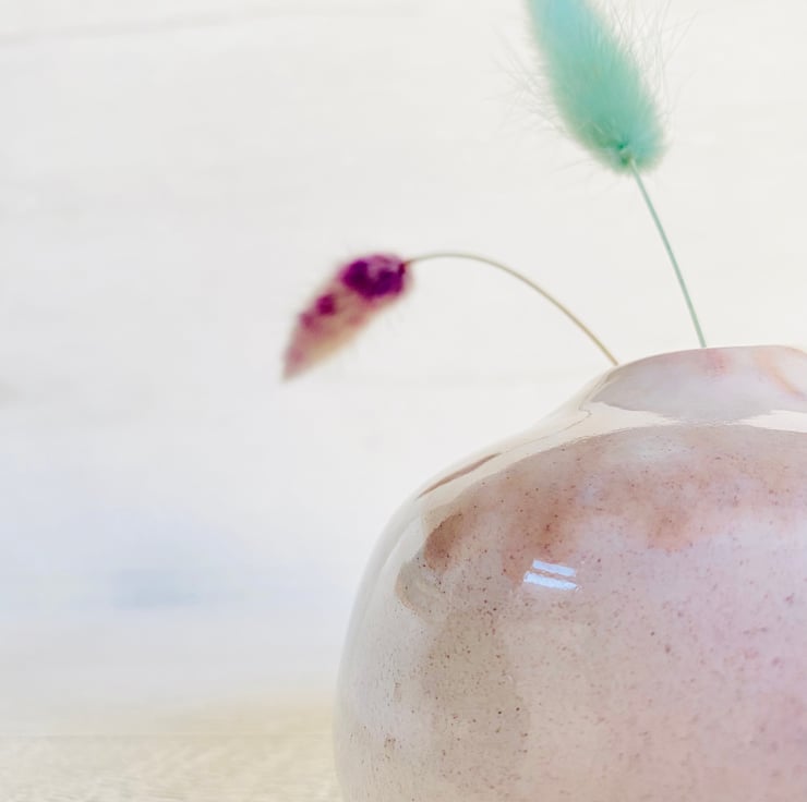 A ceramic bud vase made in a white earthenware clay, and finished with champagne and dusty pale rose gloss glazes.