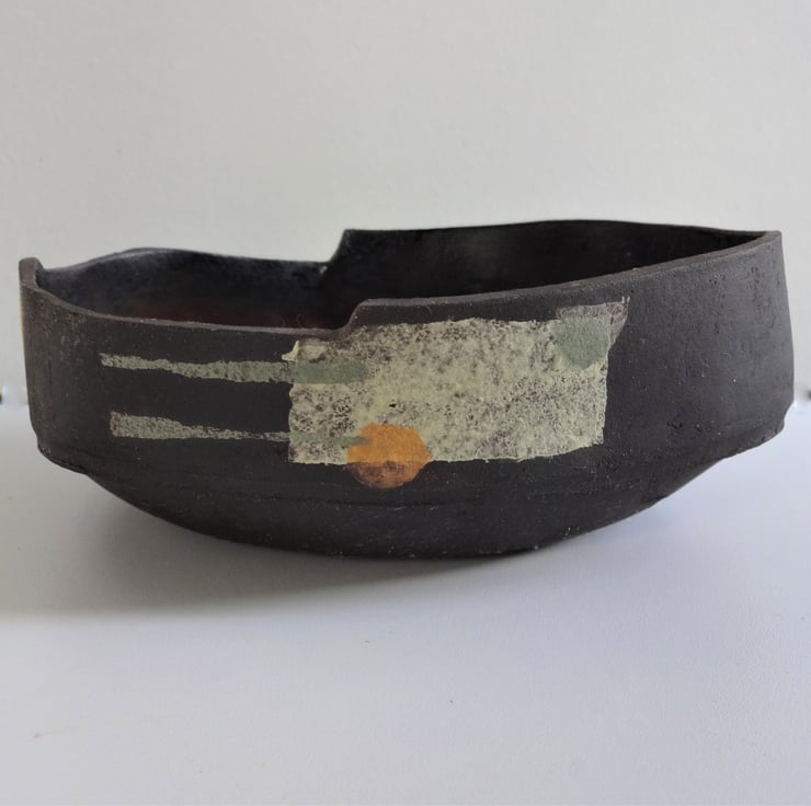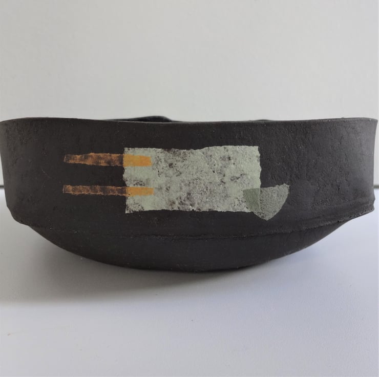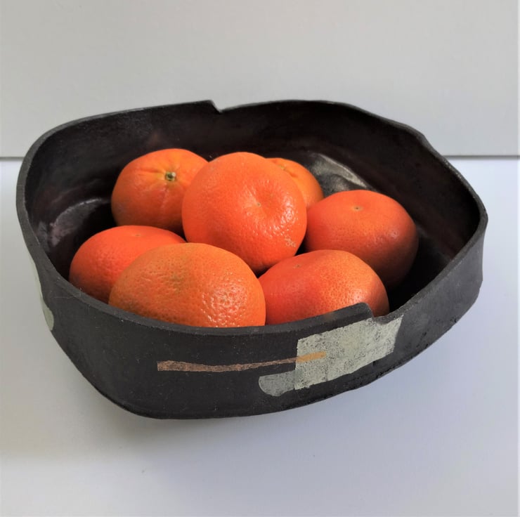 This asymmetric fruit bowl (called Morag) is unusual and eye-catching. I made it by hand from black stoneware clay with my own original abstract design motifs inspired by 1920’s textiles – a different motif on each side of the bowl in shades of pale green and sage green, lemon and ochre yellow. I form the bowl’s base by pressing separate pieces of soft clay into a mould, then create an asymmetric rim from flat sections of clay to complement the handmade nature of the piece (you will see a seam line on the outside of the bowl). I’ve glazed the inside of the bowl with a rich brown/black glaze which fires to red highlights in places. The outside of the bowl shows off the natural matt black finish of the clay, which contrasts well with the pastel shades of my abstract motifs. Approx. 18.5 cms diameter and approx. 7.5 cms high at the highest point. Underneath is my potter’s seal of a swallow in flight. The bowl could also be used to hold keys, trinkets or treasures but is not suitable for use in an oven, grill or for cooking purposes.