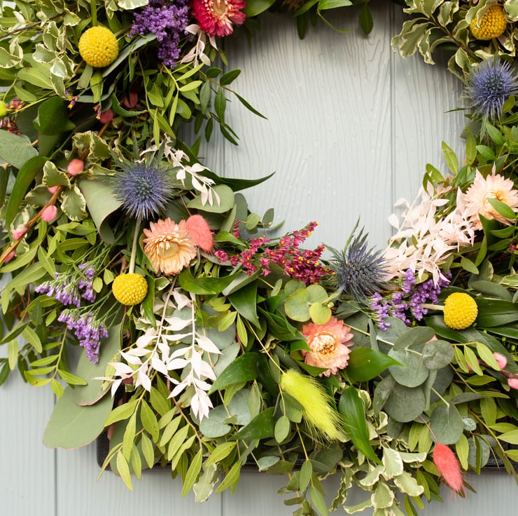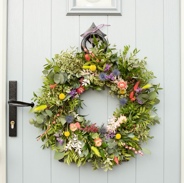 Fresh flowers will typically include beautiful sea holly thistles, billy buttons and limonium, all of which last and dry well without dying, so your wreath will stay looking lovely for longer.