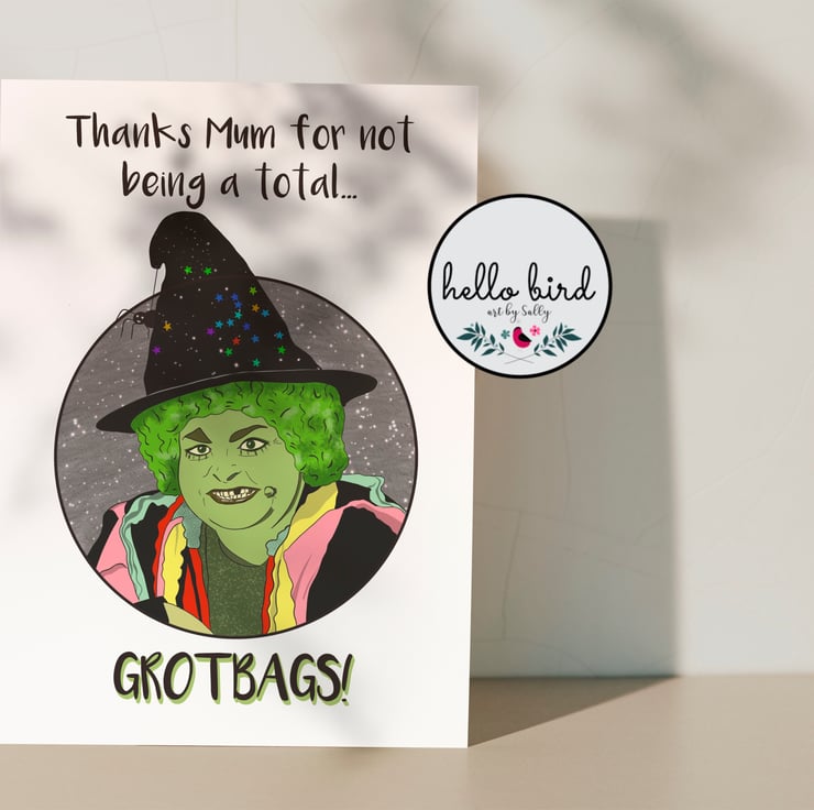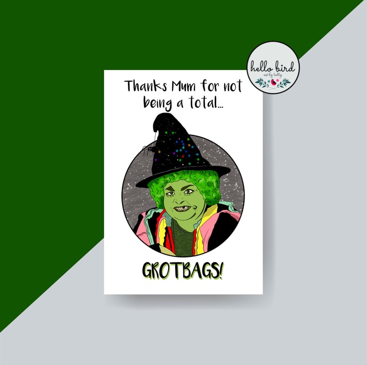 Original design greeting card featuring my own illustration of Grotbags the Witch! Features the caption 'Thanks Mum for not being a total Grotbags!' A fun and colourful Mother's Day Card perfect for 80's and 90's kids and their Mum.