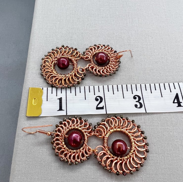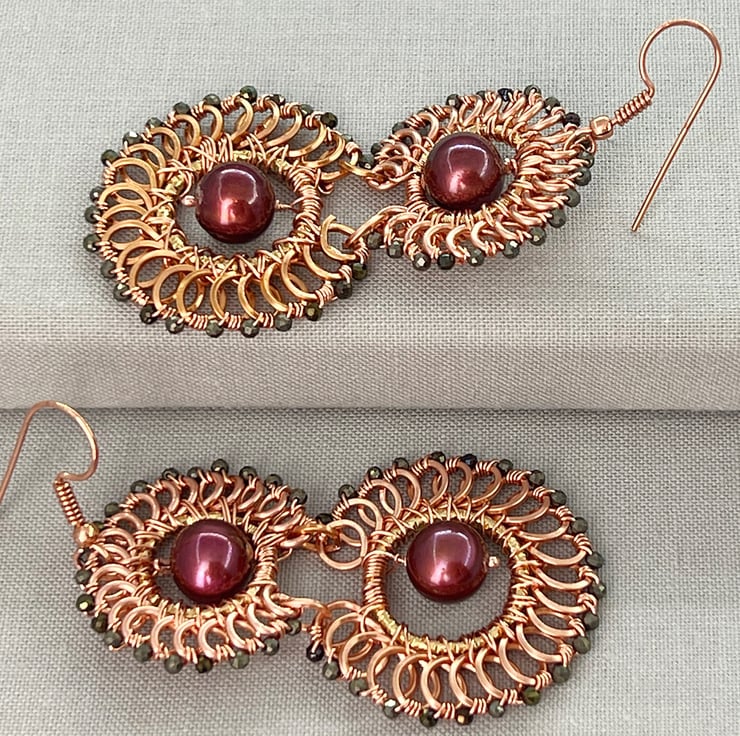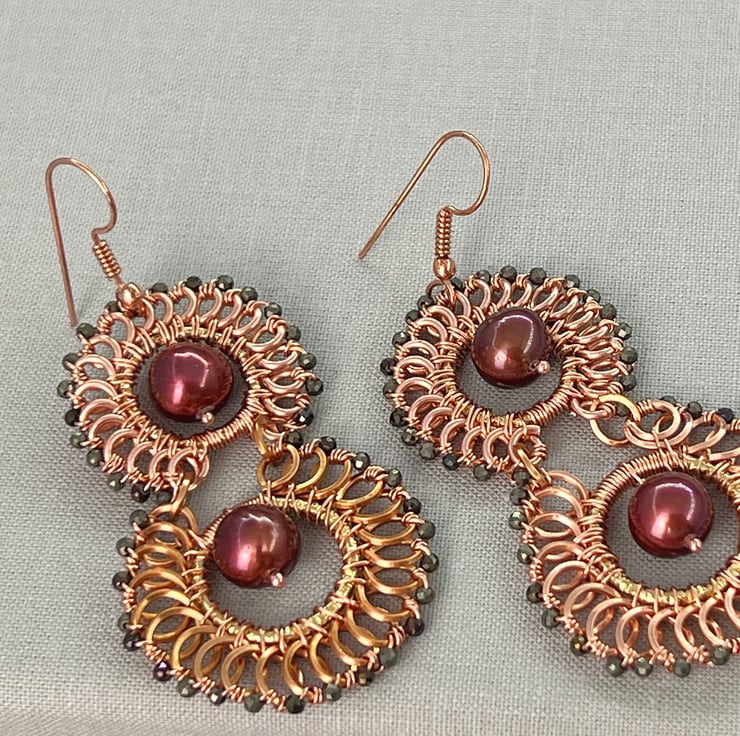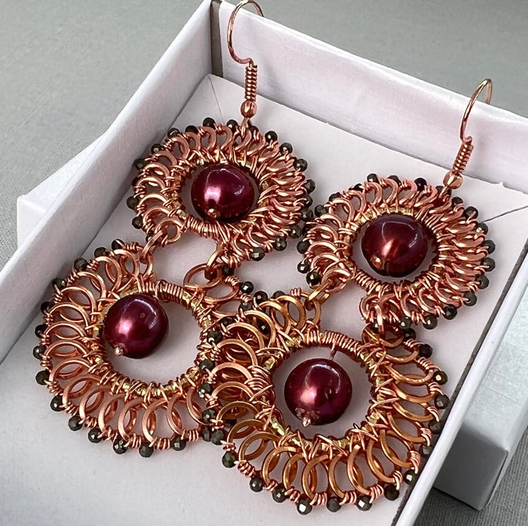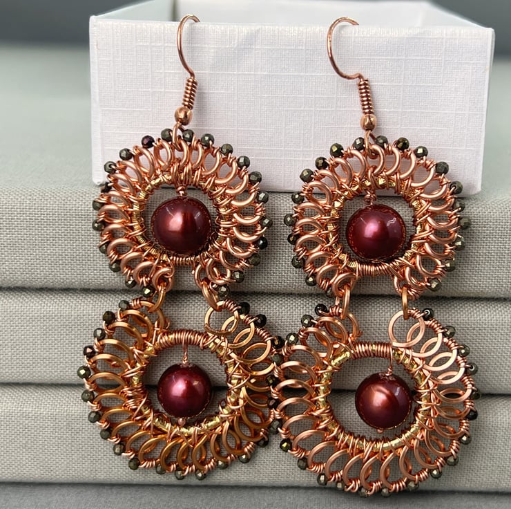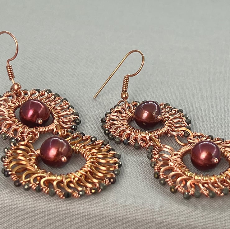 A statement pair of earrings featuring coils of copper wire with brown cultured pearls and tiny sparkly pyrite.