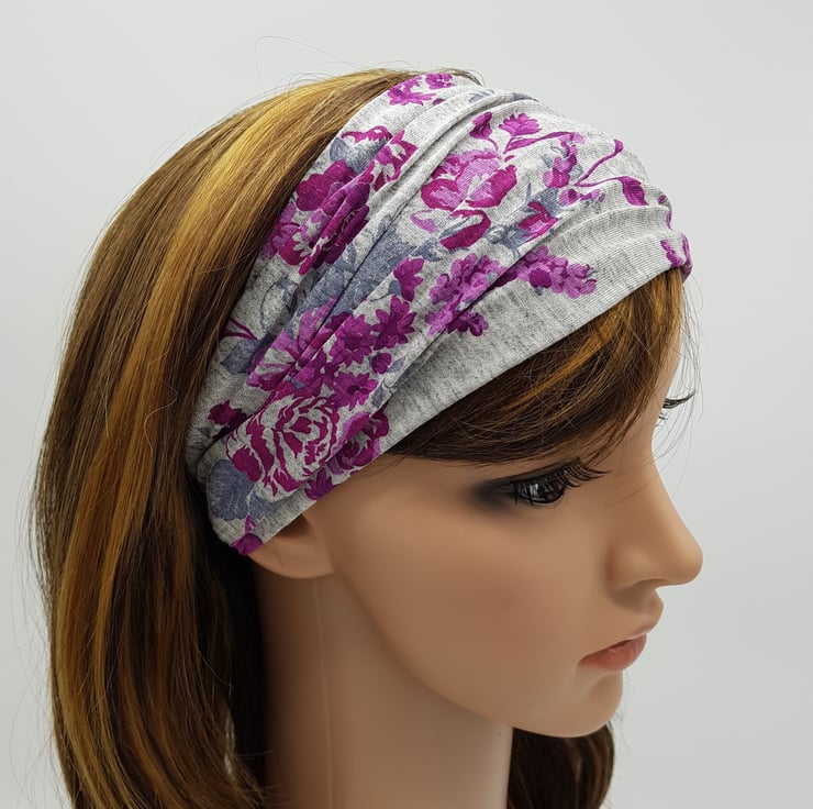 Wide headband with an elasticated back. This headband made from soft lightweight stretchy viscose jersey, it is approximately 19 cm ( 7.5" ) wide.