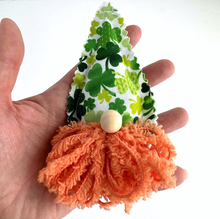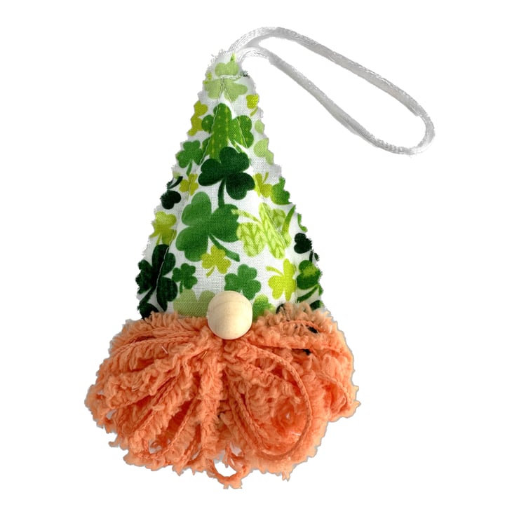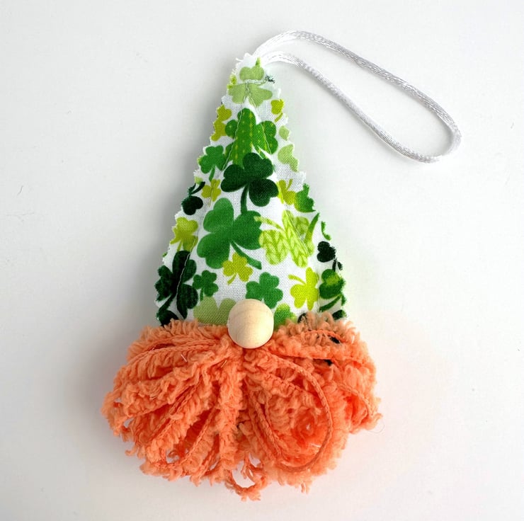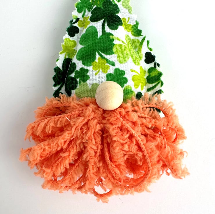 Shamrocks gnome hanging decoration, St. Patrick’s Day. This cute Scandi gnome decoration has a hat of white fabric with a print pattern of shamrocks in shades of green. I’ve added a beard made from ginger snuggly chunky yarn, and a natural wood bead nose. The hat fabric has pinked edges to give a raw scalloped finish. The decoration is lightly padded with polyester hollow fibre filling and has a hanging loop made from white satin cord.