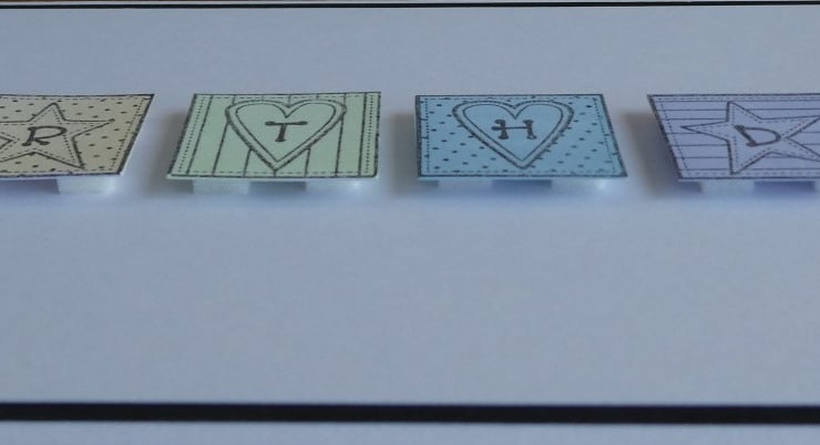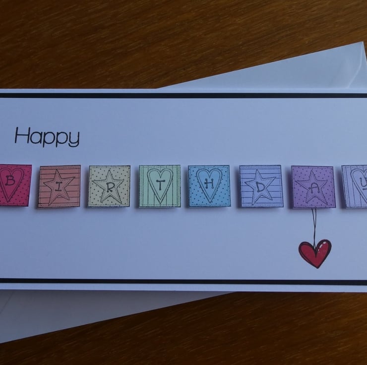 This Birthday card has a row of pastel coloured blocks stamped with individual letters spelling out the word Birthday.
