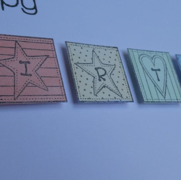 The blocks have a variety of hearts and stars with dotty and striped backgrounds and have all been hand stamped, coloured and cut.