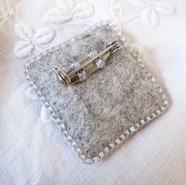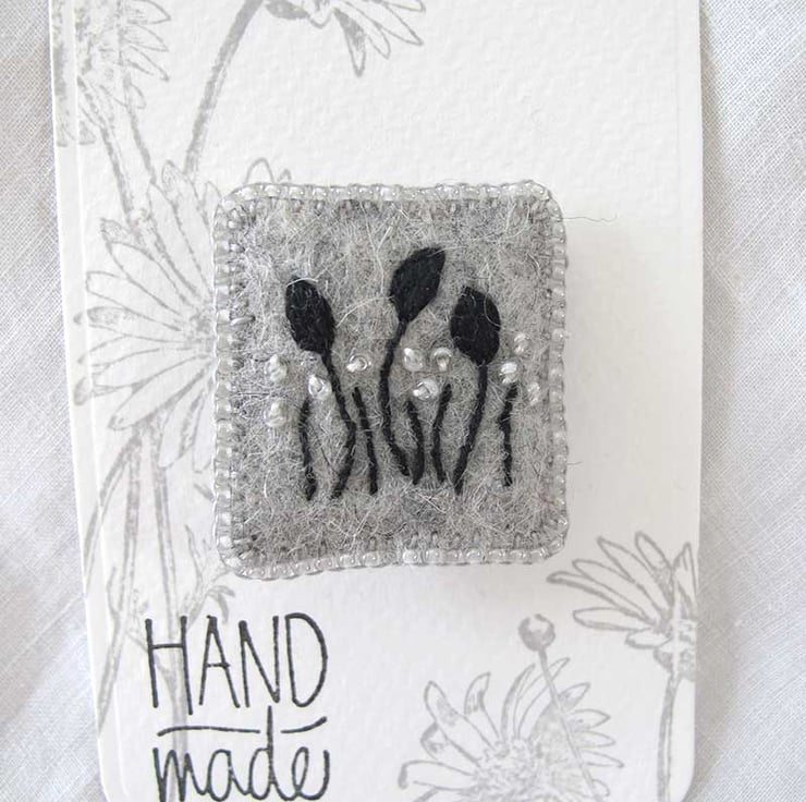 A pretty felt brooch in shades of pale grey and black. It has been embroidered by hand with little black seedlings and pale grey glass seed beads. It has been finished with an edging of the same grey glass beads and a silver coloured brooch clasp on the back.