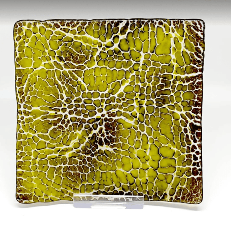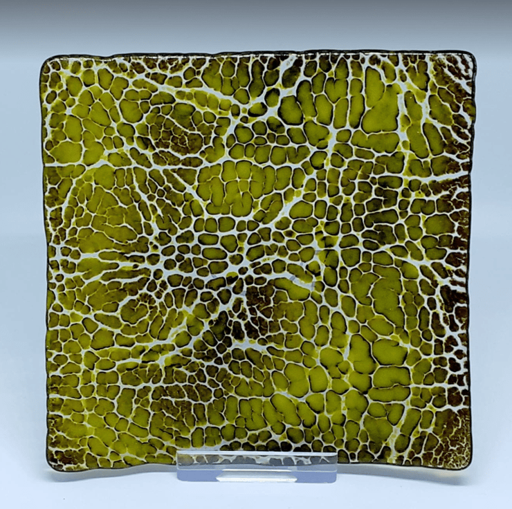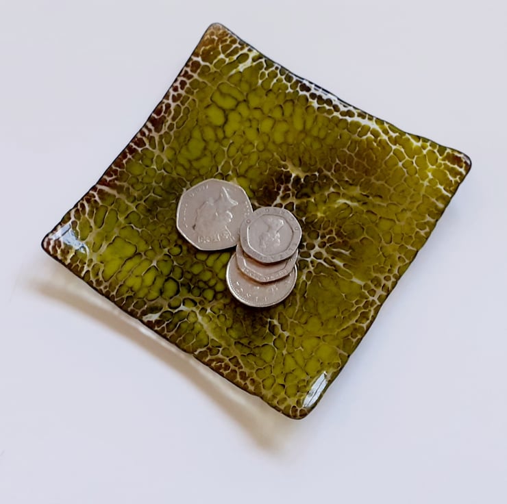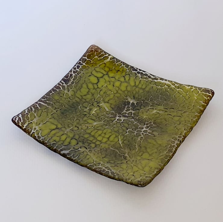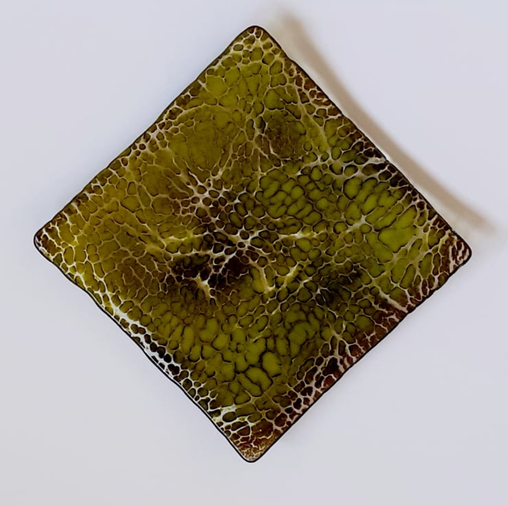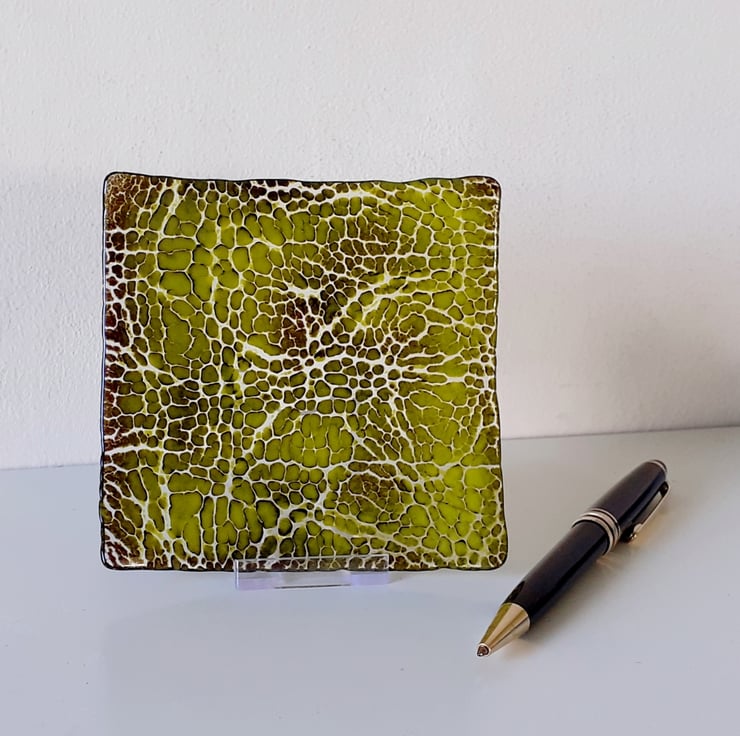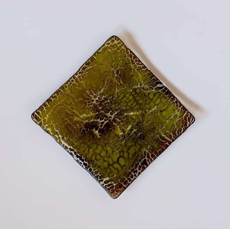 This is a little (10.5cm) square shallow dish, made using the crackle technique. The crackle effect is achieved by manipulating layers of dark brown and lime green coloured glass powders which are then fused onto a base layer of clear glass. The powders have mingled together and embedded into the base to give a lovely dappled snakeskin effect and the surface is smooth and shiny.