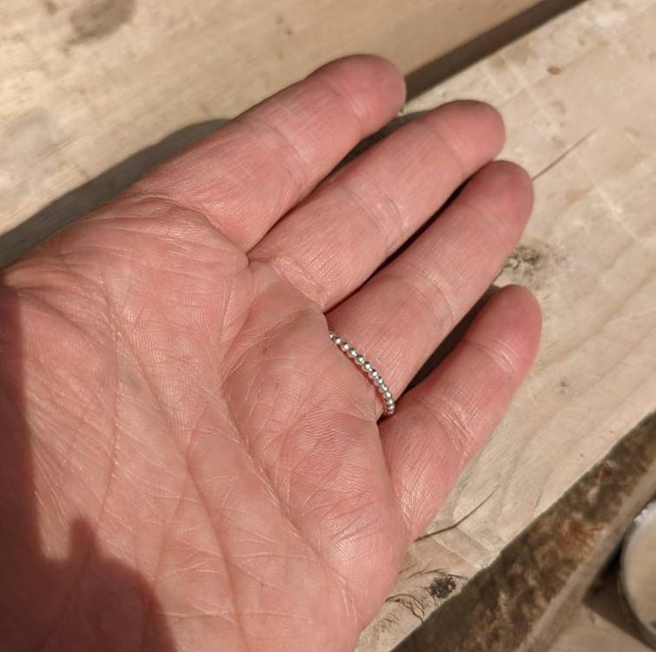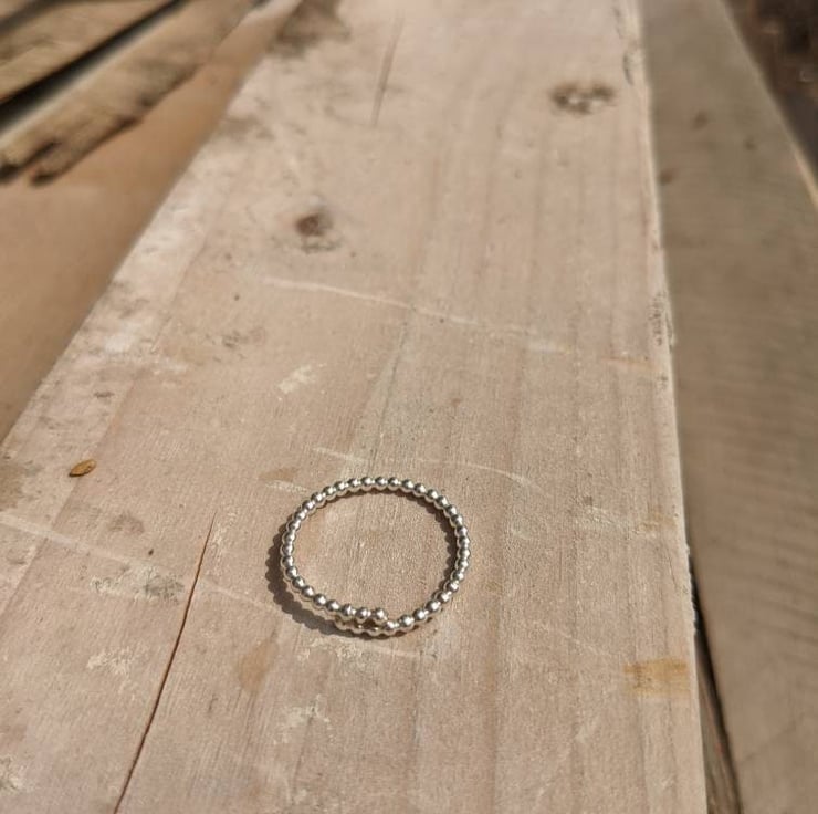 This small and delicate sterling silver ring band inspired by the simplicity of the stacking spinner rings, and influenced by the textures in both nature, the beach and the sea. With rippled sand on the shorelines and layers of rocks on the cliffs. A circle of silver balls, overlapped at the end.