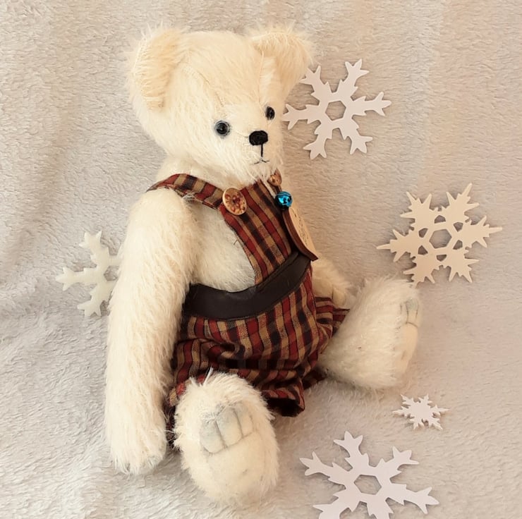 The inspiration for my bears often comes from the mohair I have chosen. Each bear is individual and once their faces have been brought to life this often helps me decide on a theme for the bear, should he be dressed or have accessories or his he perfect on his own. My dungarees are relatively new to Bearlescent and I just can't resist a bear in dungarees.