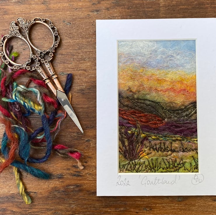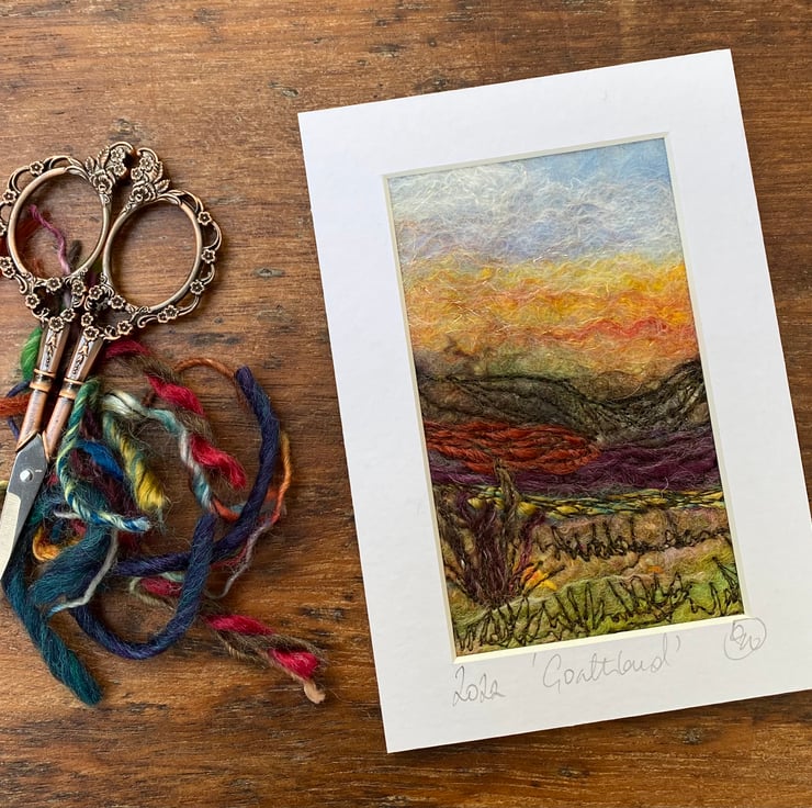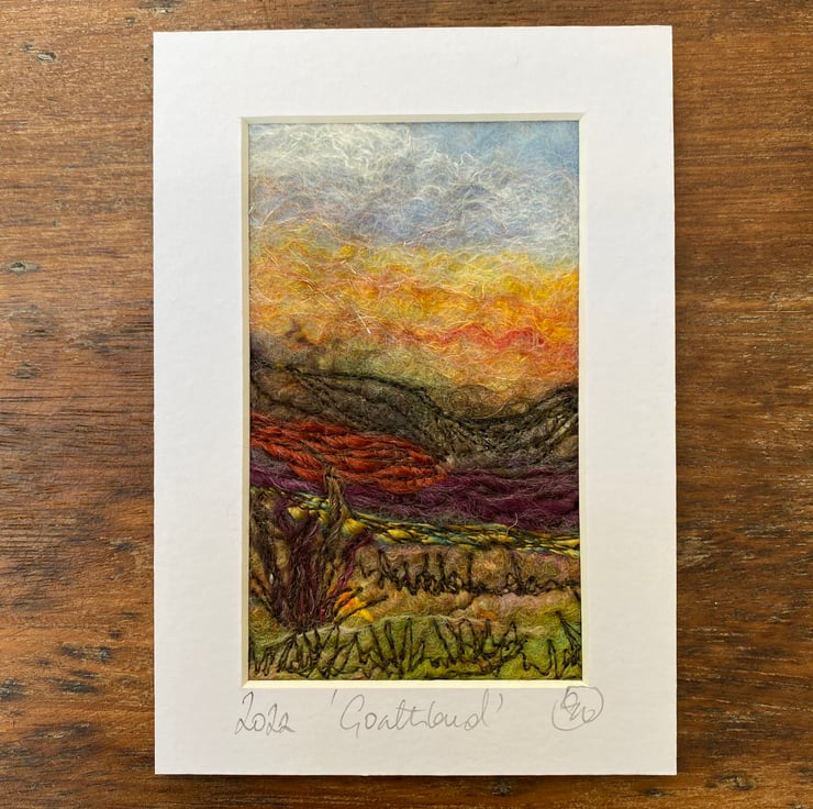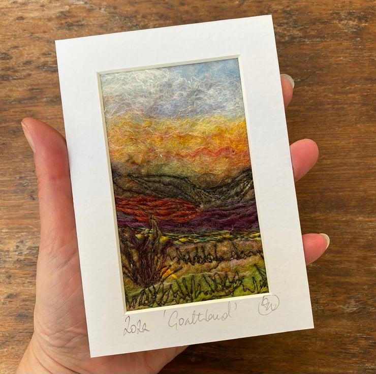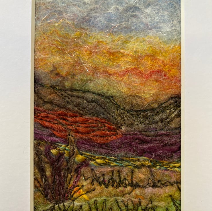 This textured landscape shows the sun setting on Goathland, North Yorkshire. It’s embroidered onto wet felting and made from merino wool, recycled silk with free motion embroidery, and it comes mounted. The artwork measures 9 x 13.5cm. The mount measures 10 x 14.5cm and the mount window measures 6.5 x 11cm.
