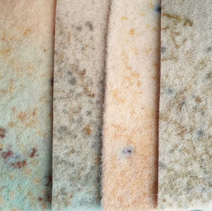 100% wool felt sheets naturally dyed in 4 colours to complement my sewing patterns. Dyed on a base colour made from oak bark chips, speckles of tea, weld, hibiscus and onion skin gradually fade across the sheets, two of which have been given a blue ombre effect.