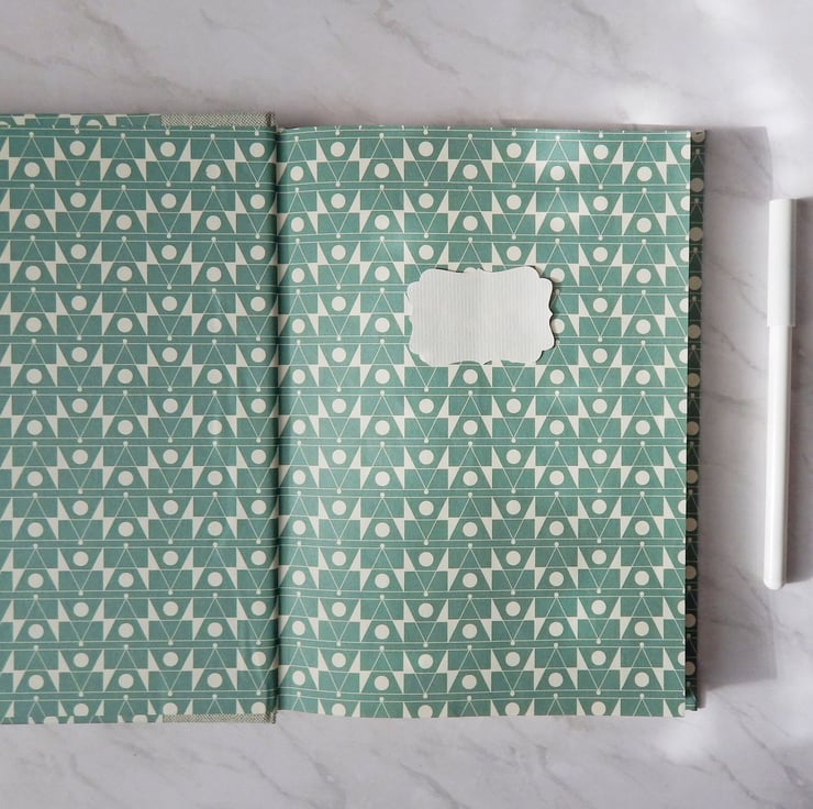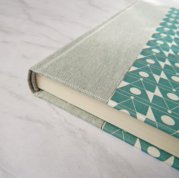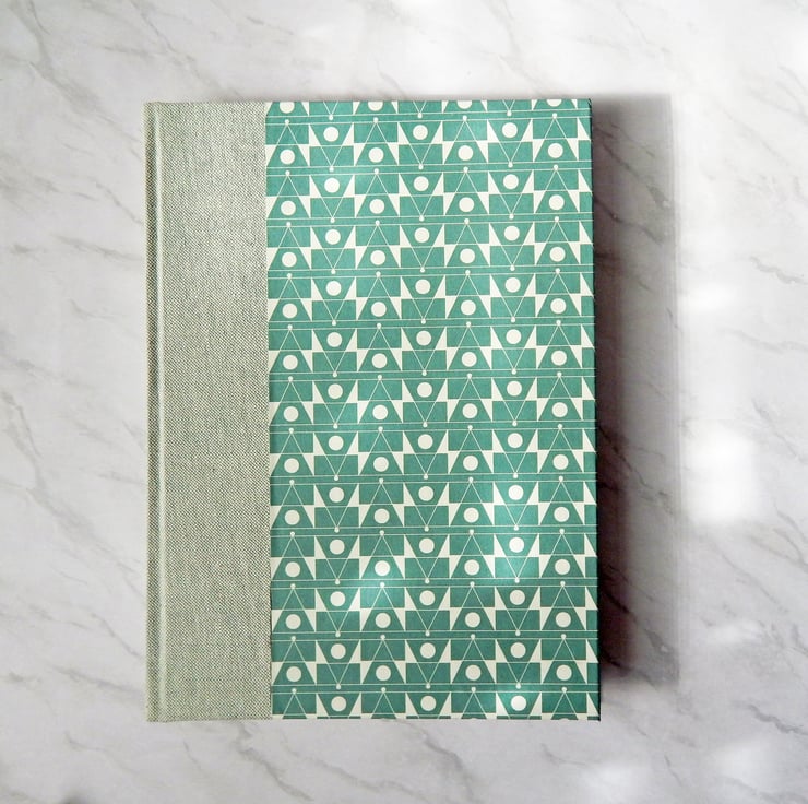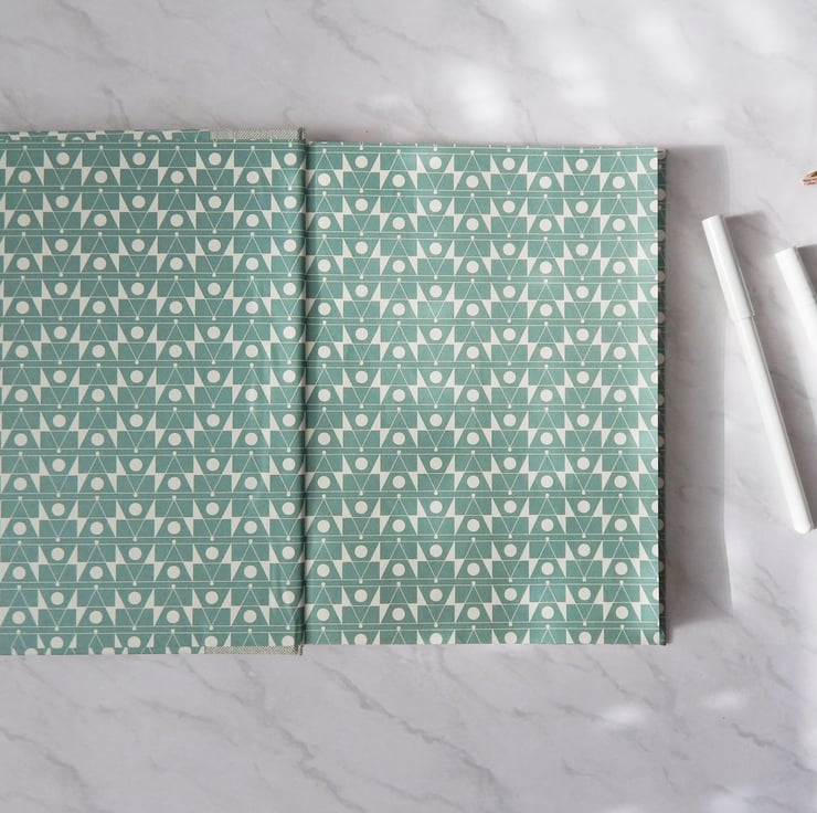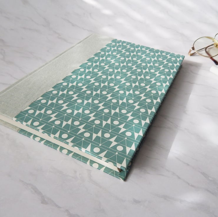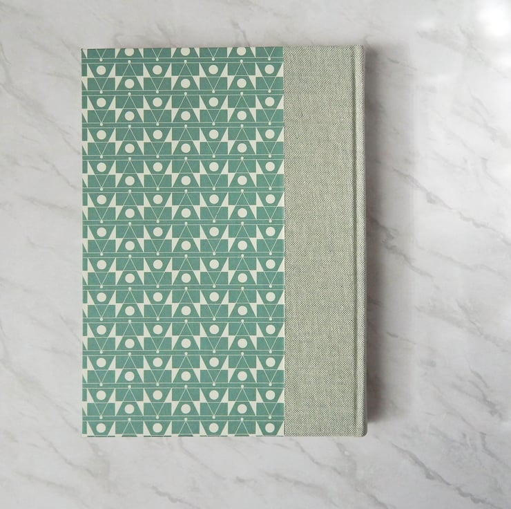 Beautiful hard covered journal with geometric covers and a spine of eau de nil linen.