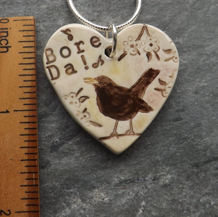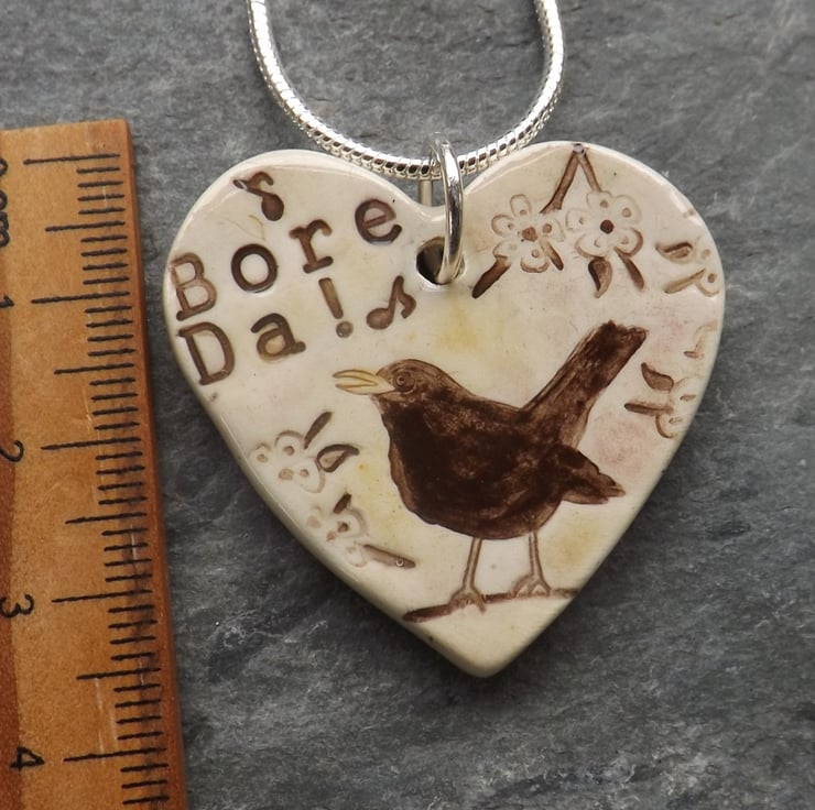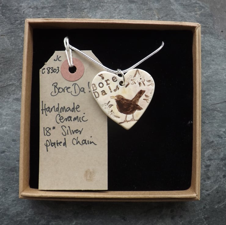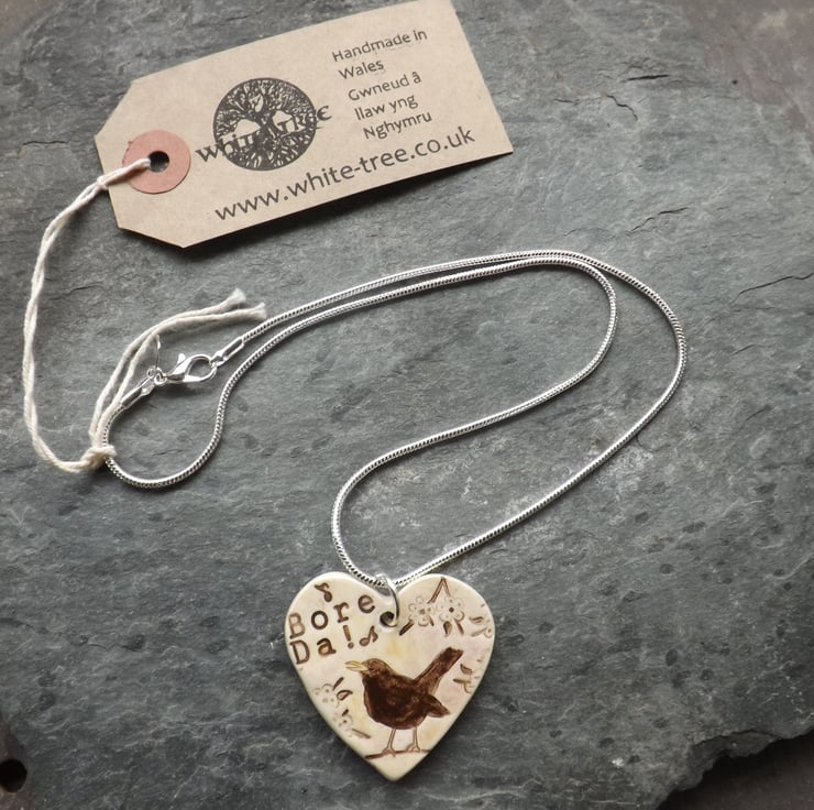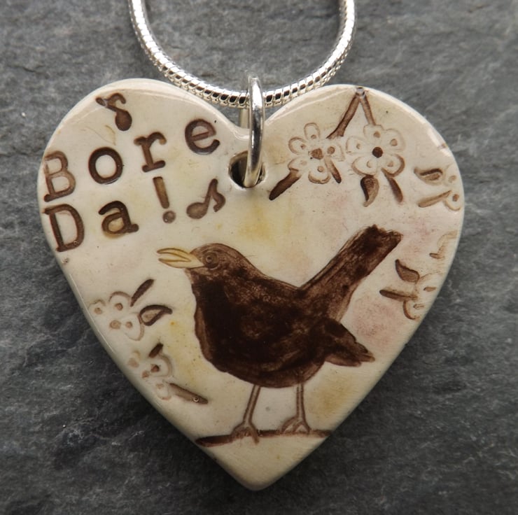 This pretty heart pendant features a blackbird amongst the blackthorn blossom, singing "Bore Da!". As with all my jewellery it is made and decorated entirely by hand.