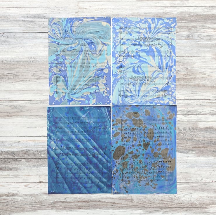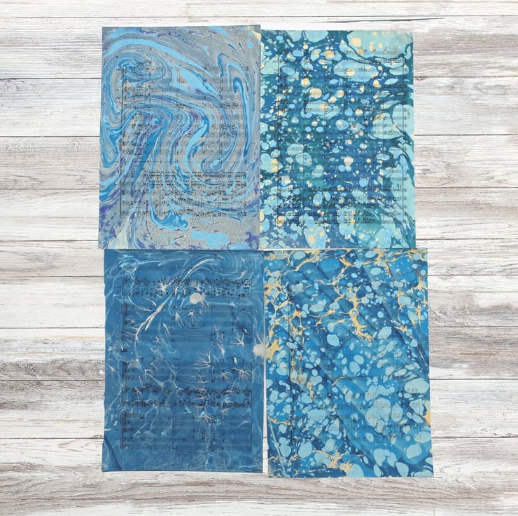 Mixed pack of 11 marbled ephemera sheets in blues of many different designs. These sheets are 18.5x13.5cm so slightly smaller than A5.