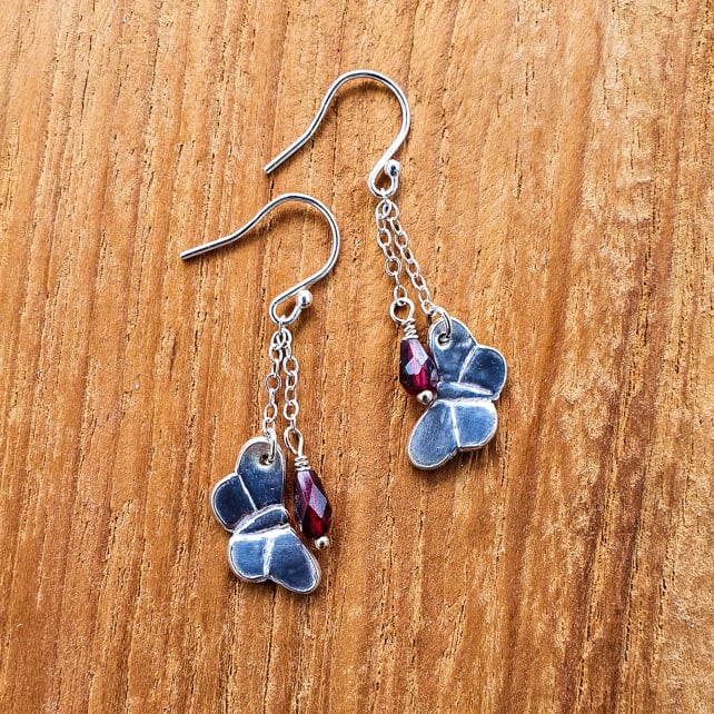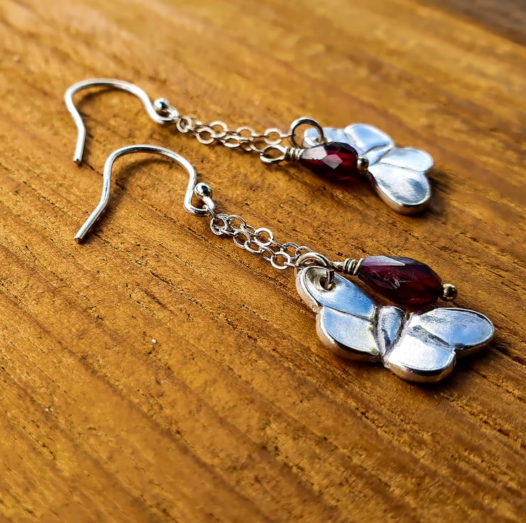 Beautiful dainty silver butterfly and garnet earrings, handcrafted from recycled fine (99.99%) and sterling silver.