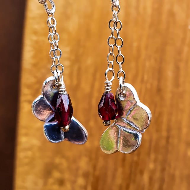 Each earring is adorned with a faceted garnet, the birthstone for January, adding a rich and vibrant touch to complement the silver butterflies, and making them a thoughtful gift for January birthdays. They are finished with a pair of my handmade recycled sterling silver ear wires.
