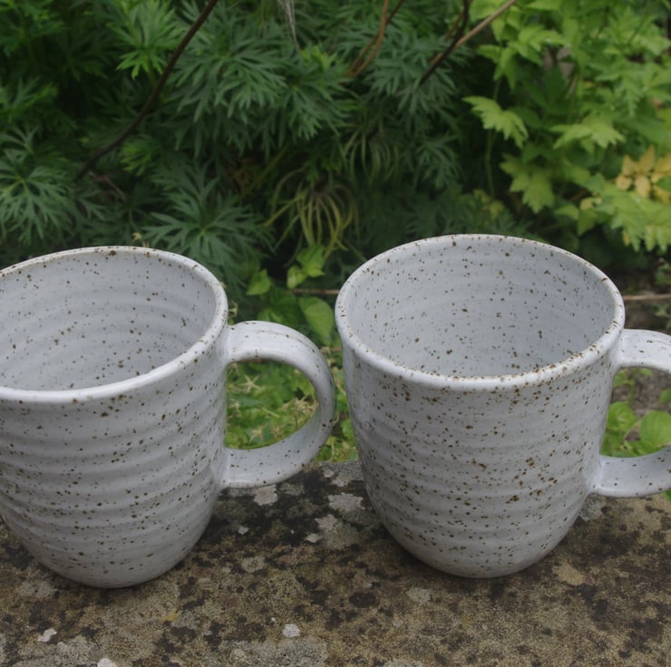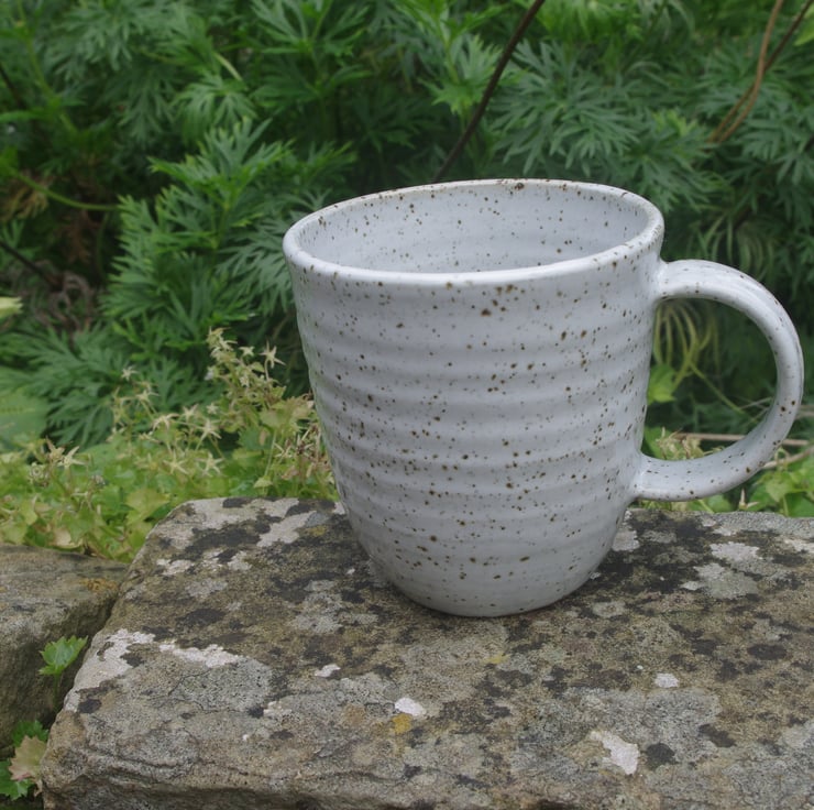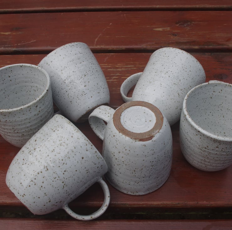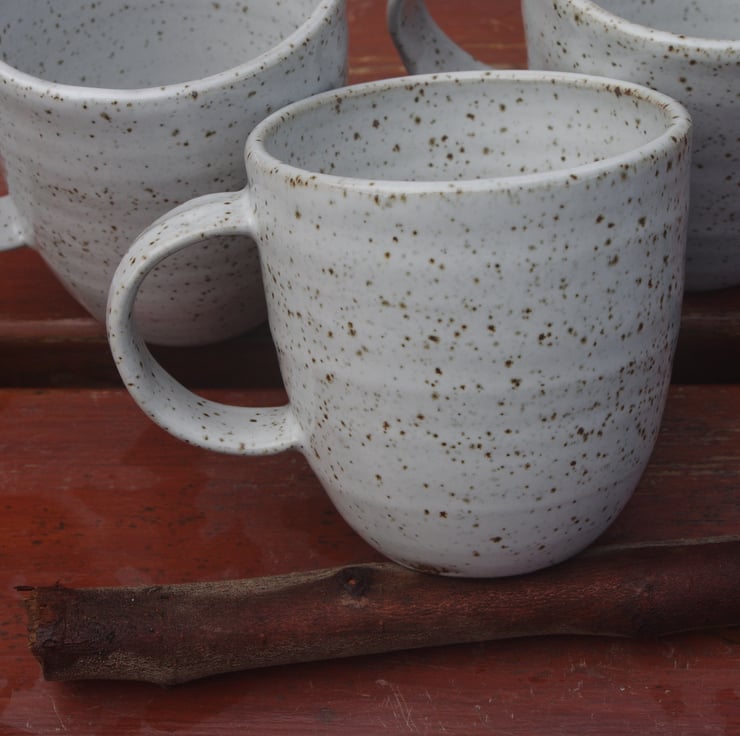 I love the simplicity of the design and its contemporary style handle. The speckled nature of the glaze is developed by the gas kiln firing, which melts iron oxide particles in the clay, which react with the pure white glaze.